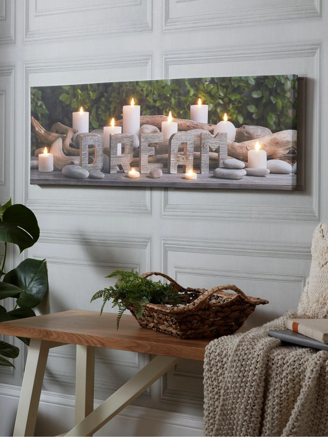 Full of rustic charm, the word Dream is surrounded by a series of candles and pebbles, along with a lush green backdrop. LED bulbs sit in place of each candle’s flame, giving the 90 x 30 cm canvas a warm, inviting glow that makes your space feel incredibly cosy and welcoming.