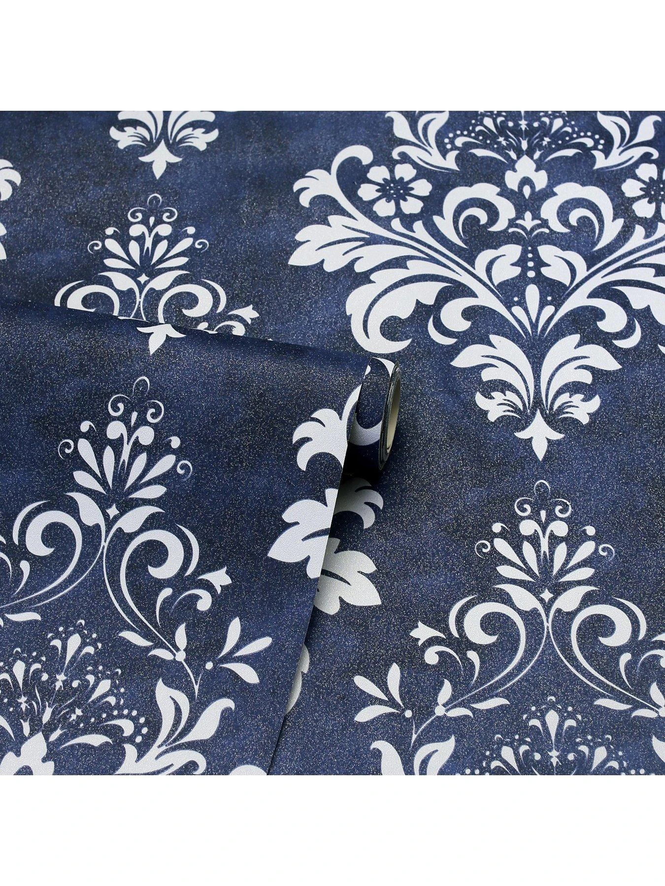 This Baroque Damask Wallpaper is an easy way to add a striking look to your walls. The stunning design is perfect for adding a delicate look within any room of your home. This wallpaper features a prominent grey baroque style damask on a deep navy background, with an all over glitter finish, which highlights the beautiful, embossed design. This vinyl paper is suitable for high traffic areas of the home including kichens and bathrooms and is wipeable.