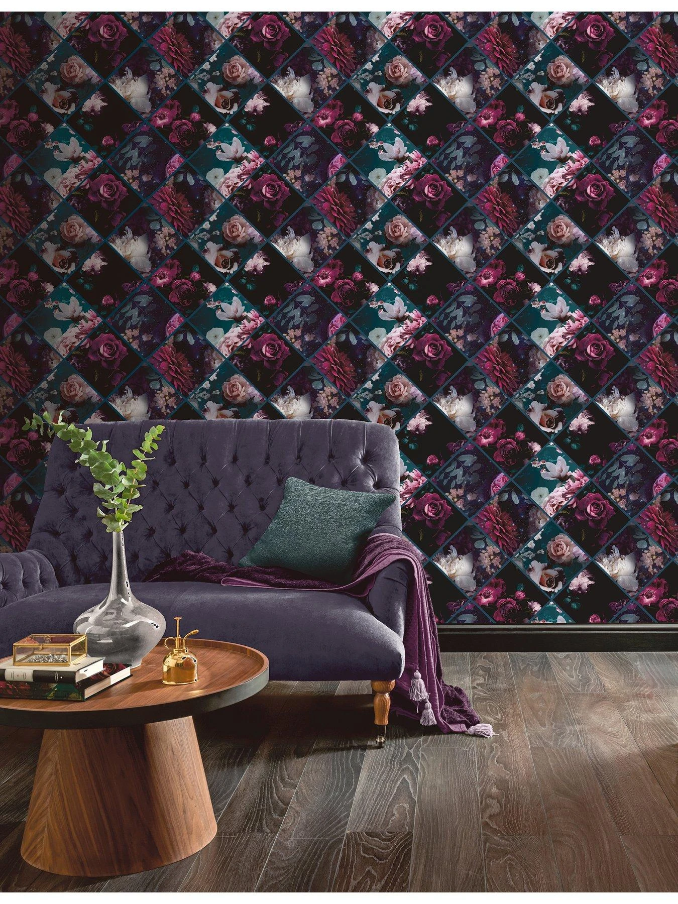 Dark and dramatic, this photographic style wallpaper depicts floral motifs, in contemporary plum and petrol blue tones on a dark black background. This wallpaper adds drama to any room thanks to its striking collage design style and soft glitter finish. This paper is the perfect choice for a feature wall or chimney breast in a bedroom – paired with painted walls to draw the eye to its design. You could also hang it in a cloakroom or living space to get the look you want. Suitable for most rooms except high moisture environments, like bathrooms.