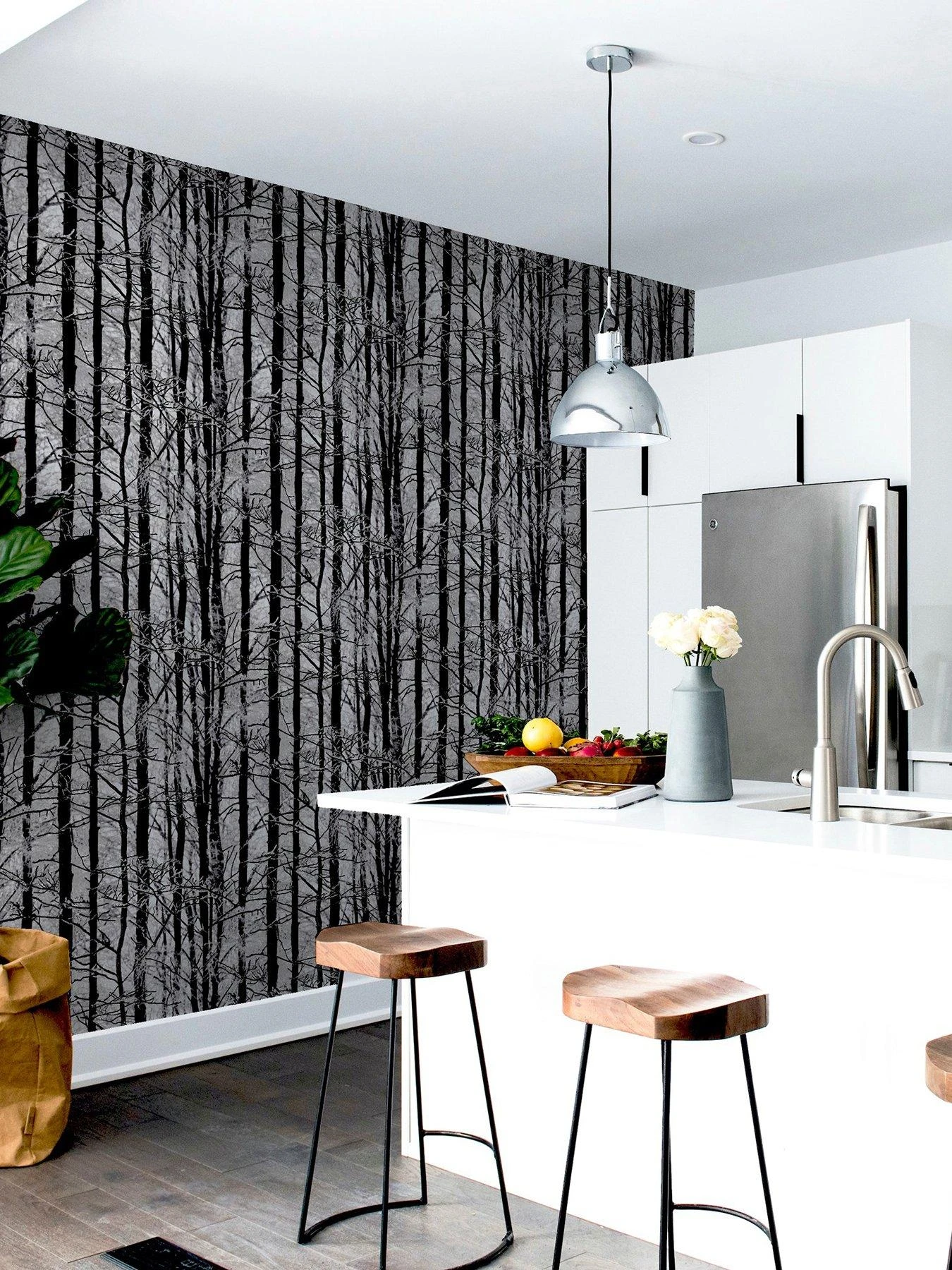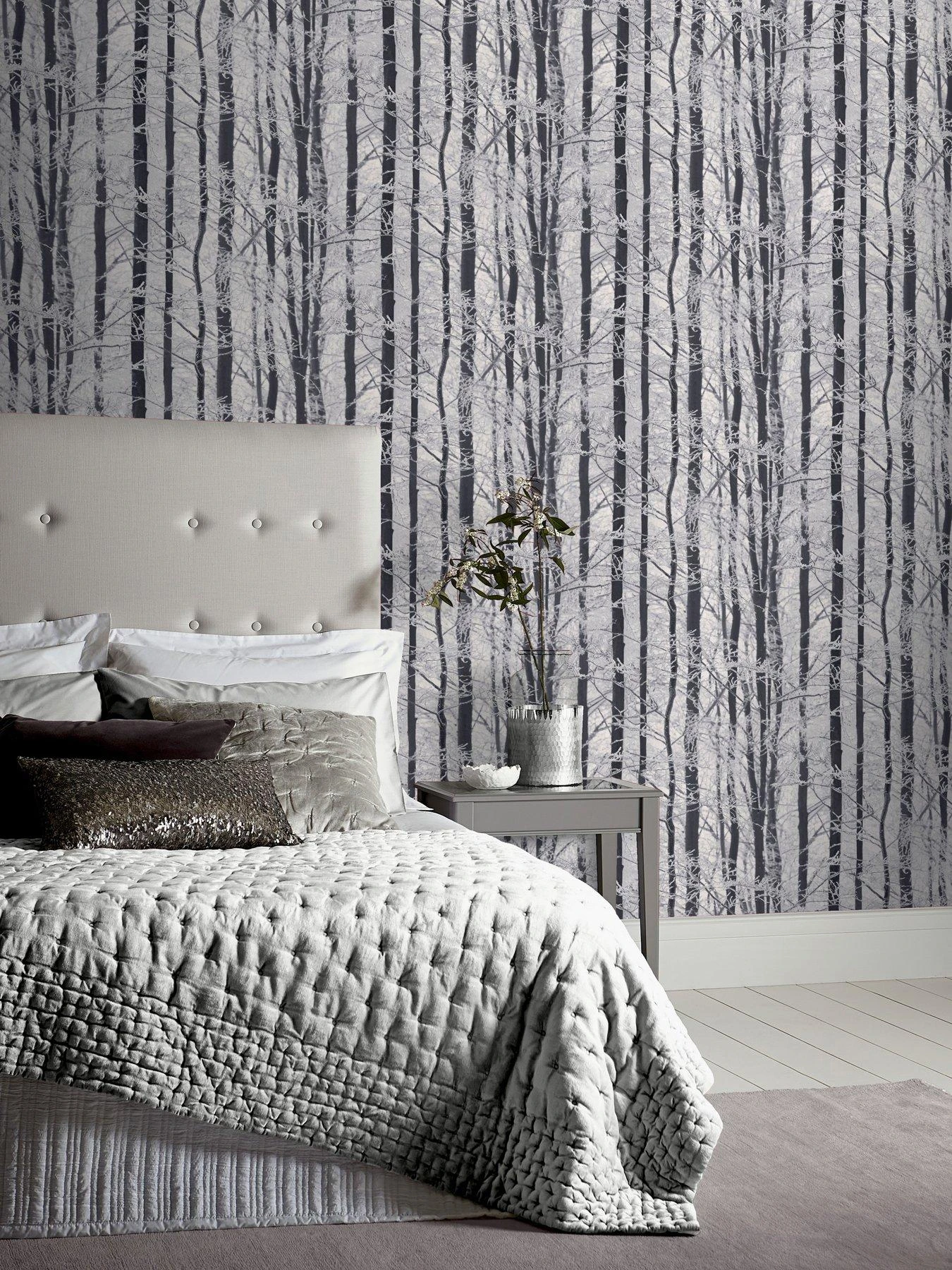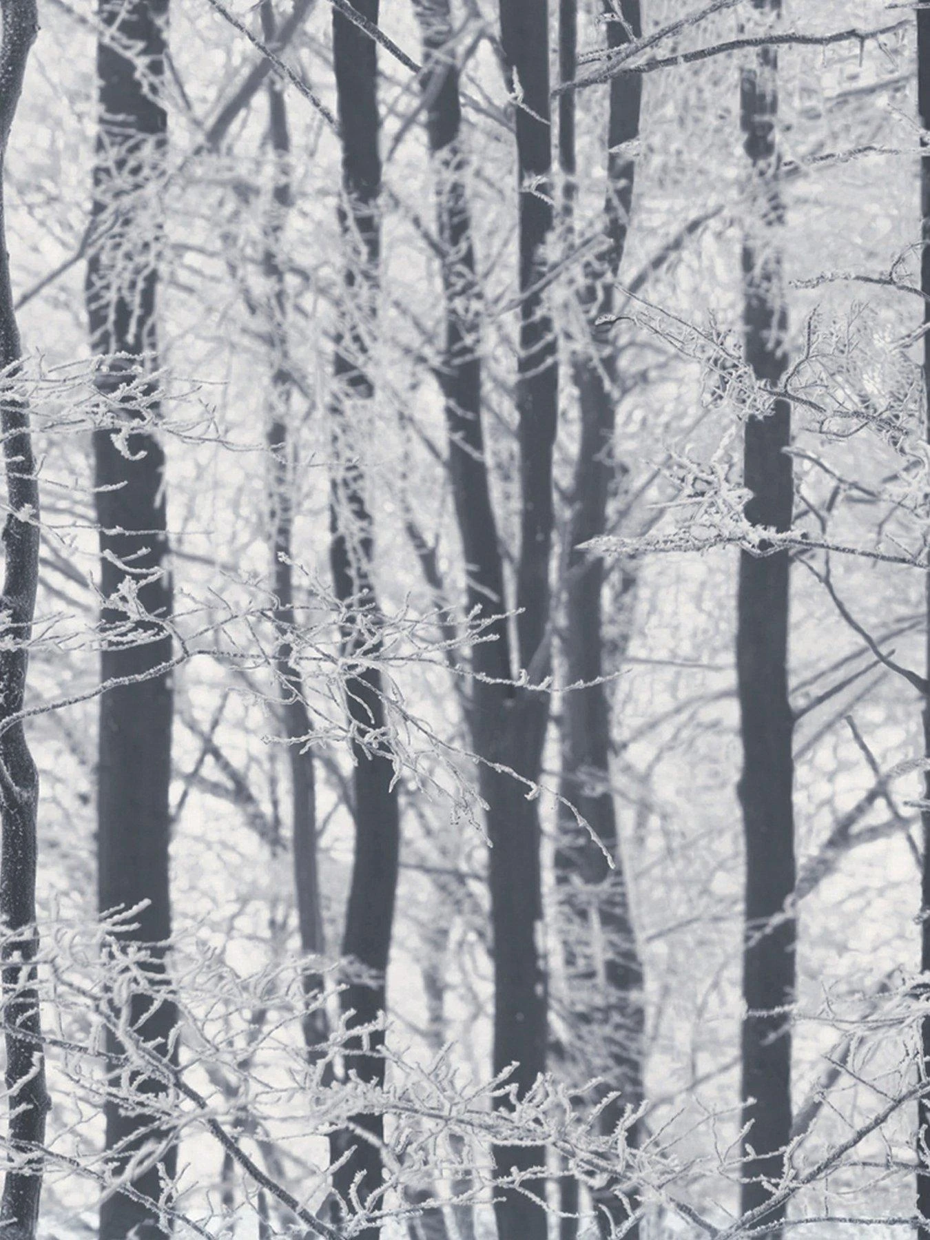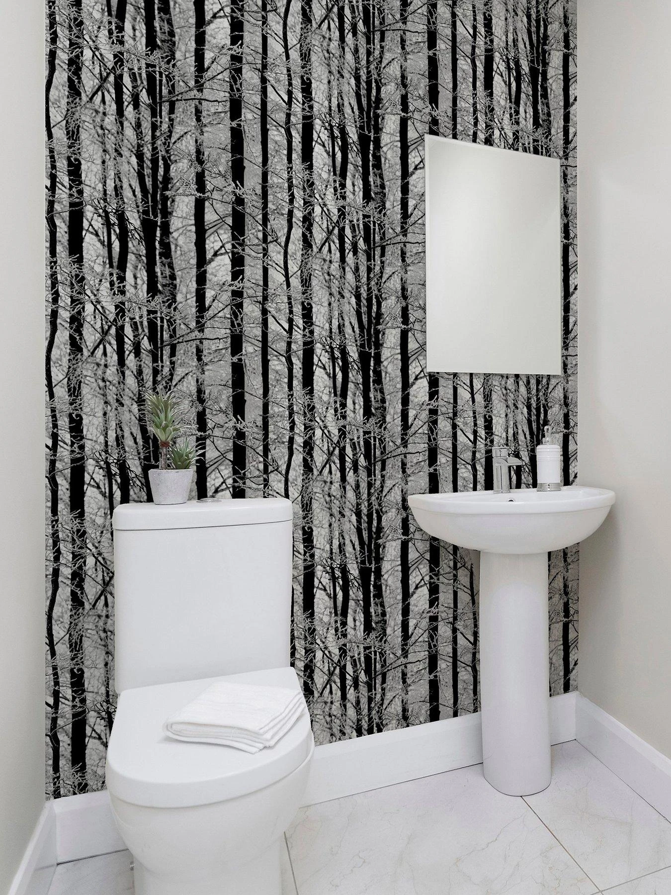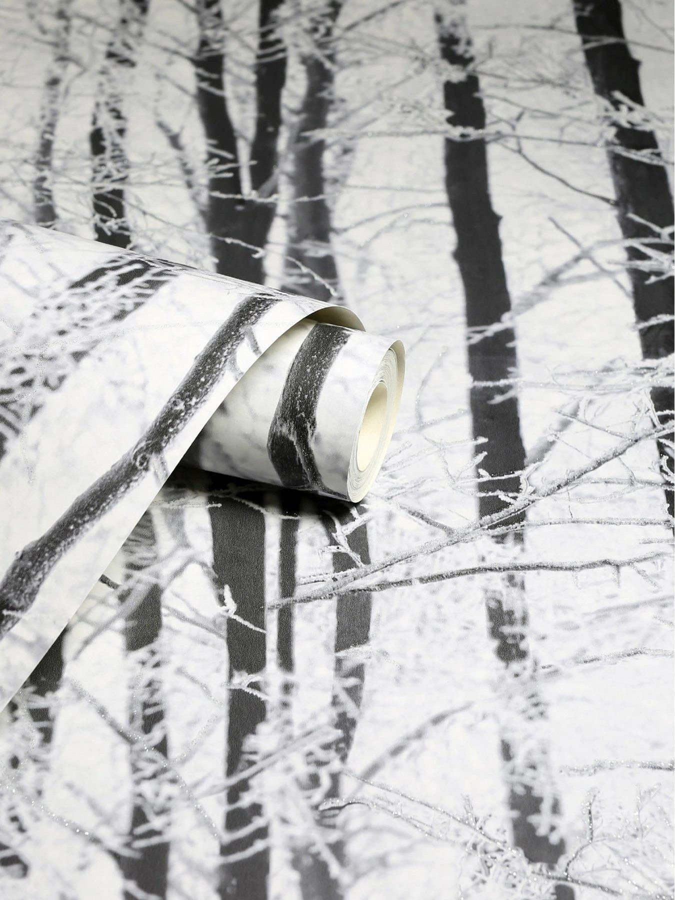 Create the very bang on-trend forest effect in your room with this wallpaper design that features frosted black trees on a white snowed background. The wallpaper is highlighted with encased glitter that catches the light beautifully.