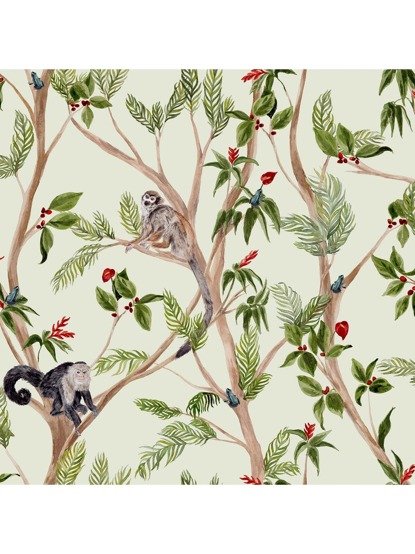 The mischievous design is full of charm, featuring lots of little monkeys sat amongst tree branches with small leaves and frogs all around them. A light cream backdrop and matt finish elevates the look and ensures this paper works just as well as a feature wall focal point as it does all around a new arrival’s nursery.
