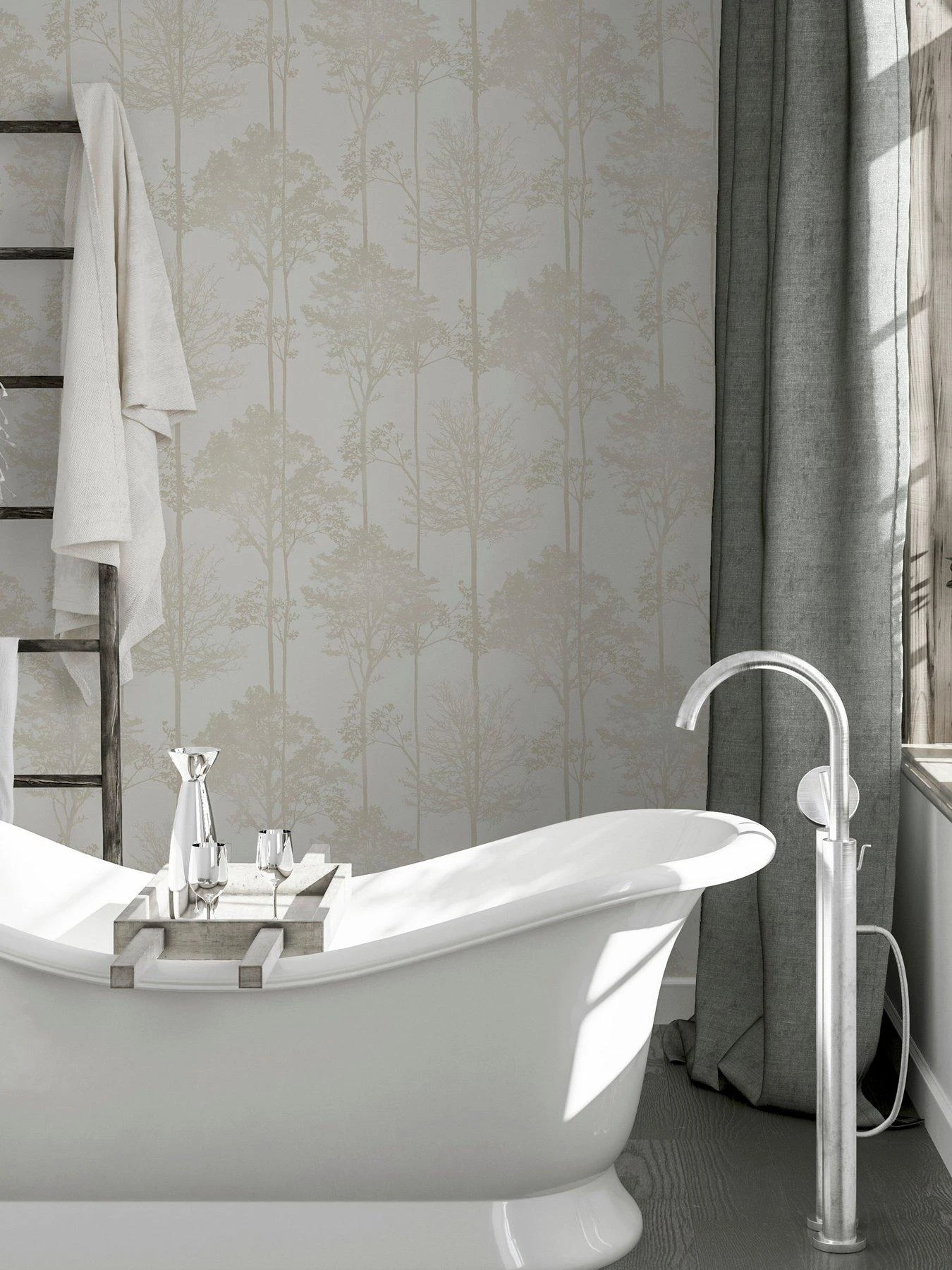 This subtly glittering wallpaper features gold silhouettes of trees on a neutral background. On a textured background that brings a luxurious feel to the home, it’s a design that will upgrade your room whether this is a traditional or a contemporary style. This vinyl wallcovering is not only tough and hardwearing, it will also cover slight imperfections on your walls. It can be hung in a living room, dining room, hallway, bedroom or bathroom and get a great finish, every time.