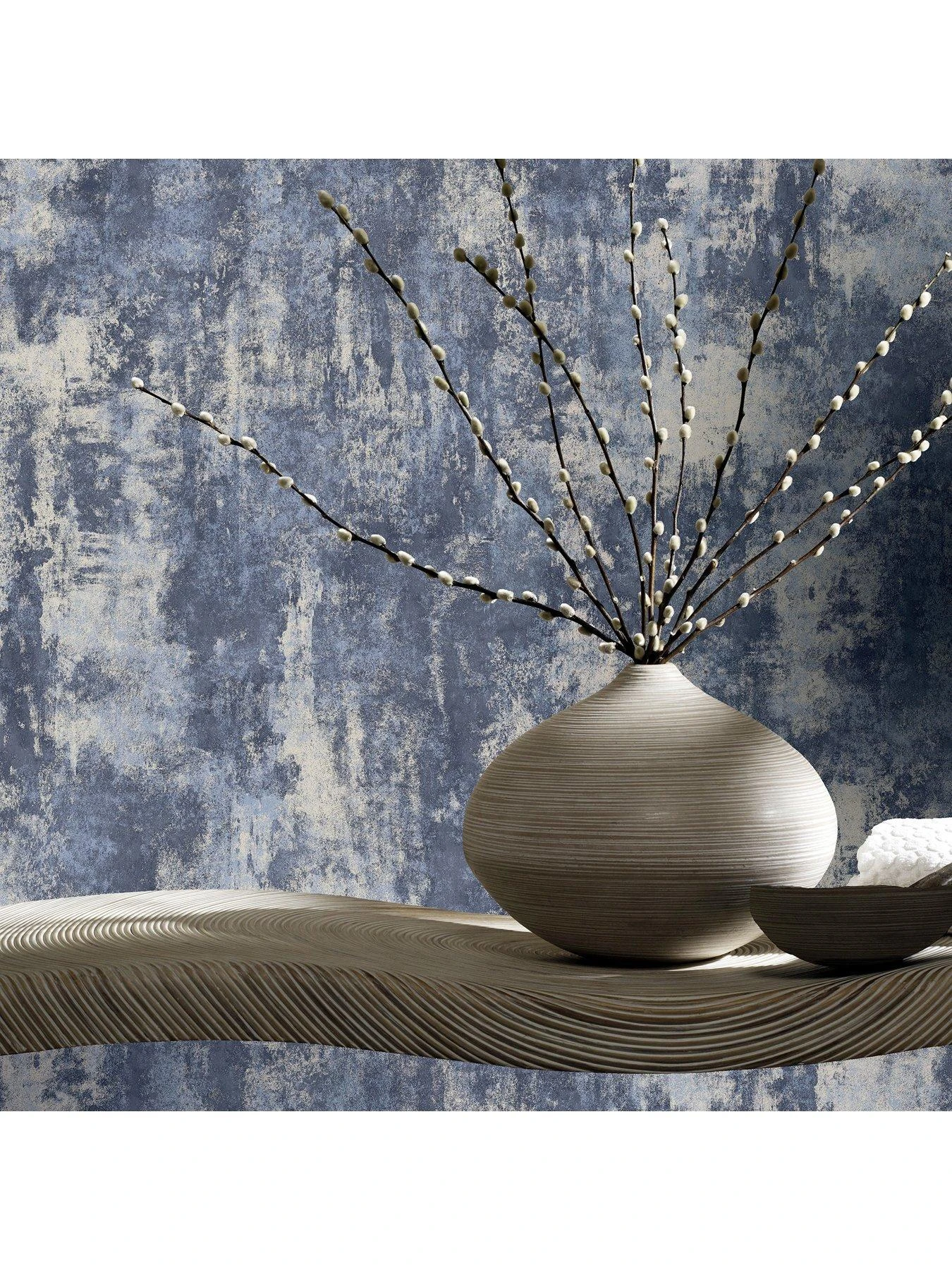 Add a natural vibe to a room with this striking and modern wallpaper. Blending a rough textured stone effect with subtle metallic highlights, the overall look is lived-in yet luxurious – and the mixture of navy blue and silver tones introduce a sense of indulgent warmth. The perfect backdrop to a relaxed living room or dining room, this paper embraces the trend for minerals and organic effects.