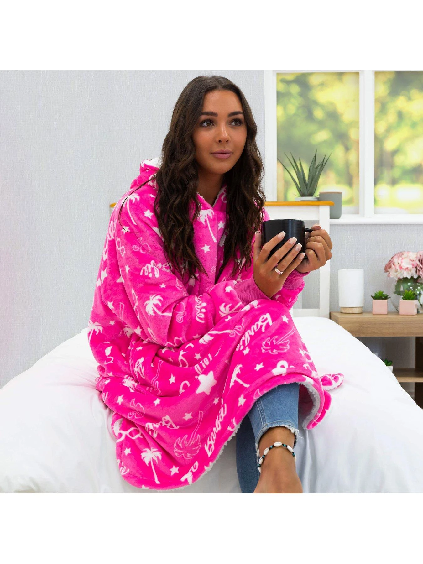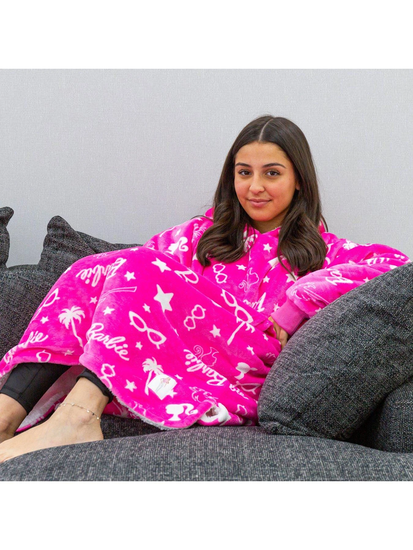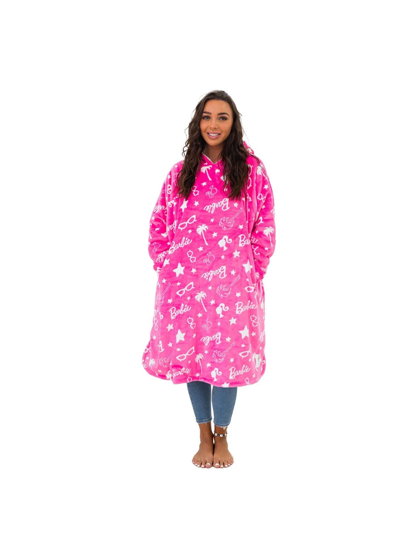 In bright pink, the fab design features palm tree and star graphics in white, along with the iconic Barbie logo all over. The oversized design stretches down past the wearerās knees, making it perfect for cosy and warm whether theyāre watching TV, relaxing on the sofa or simply having a sneaky afternoon nap.