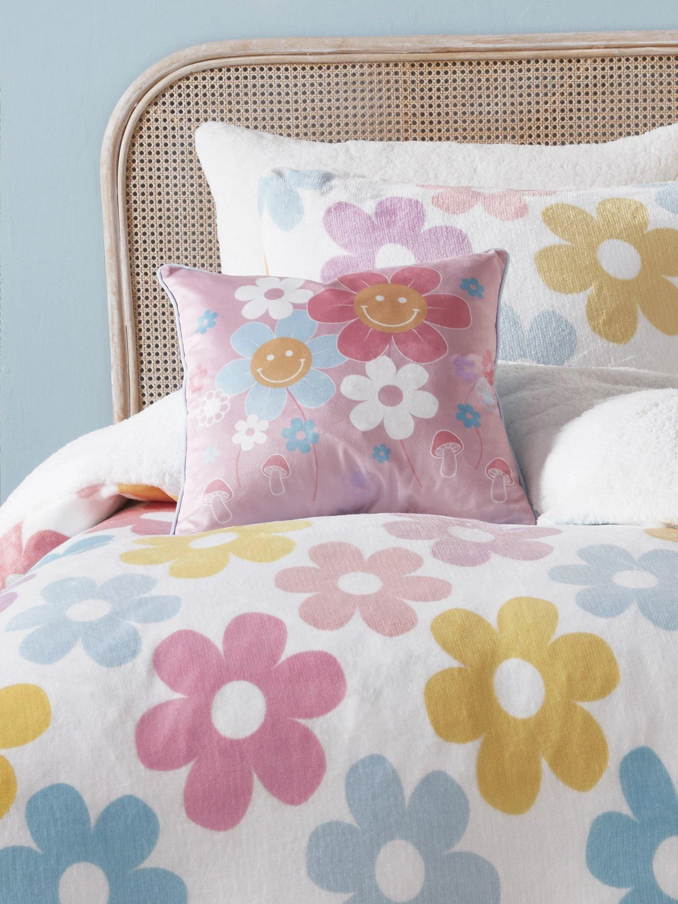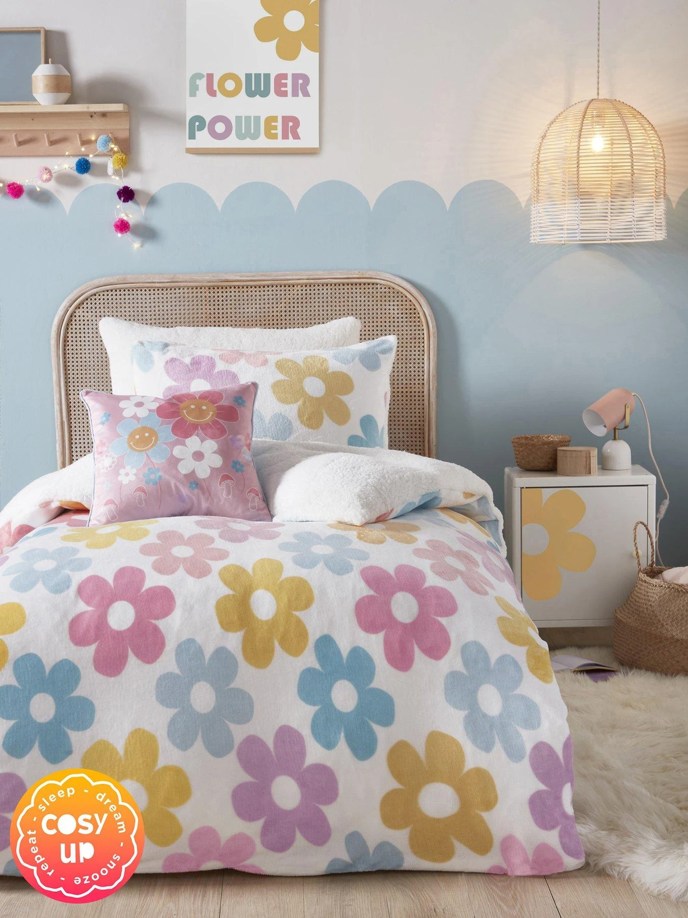 - A simple, retro inspired floral is printed on to this super soft fleece bedding with white sherpa fleece reverse to ensure the snuggliest nights sleep