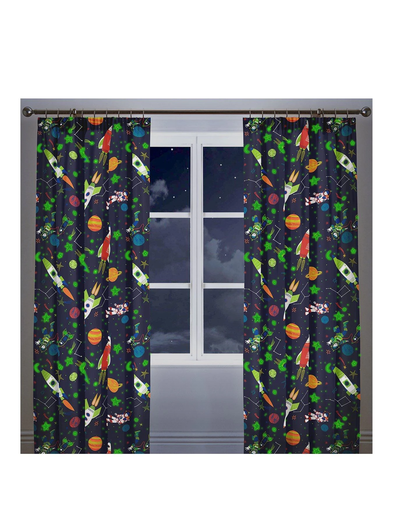 Create a look that’s out of this world with the Supersonic glow in the dark pleated curtains from Bedlam.