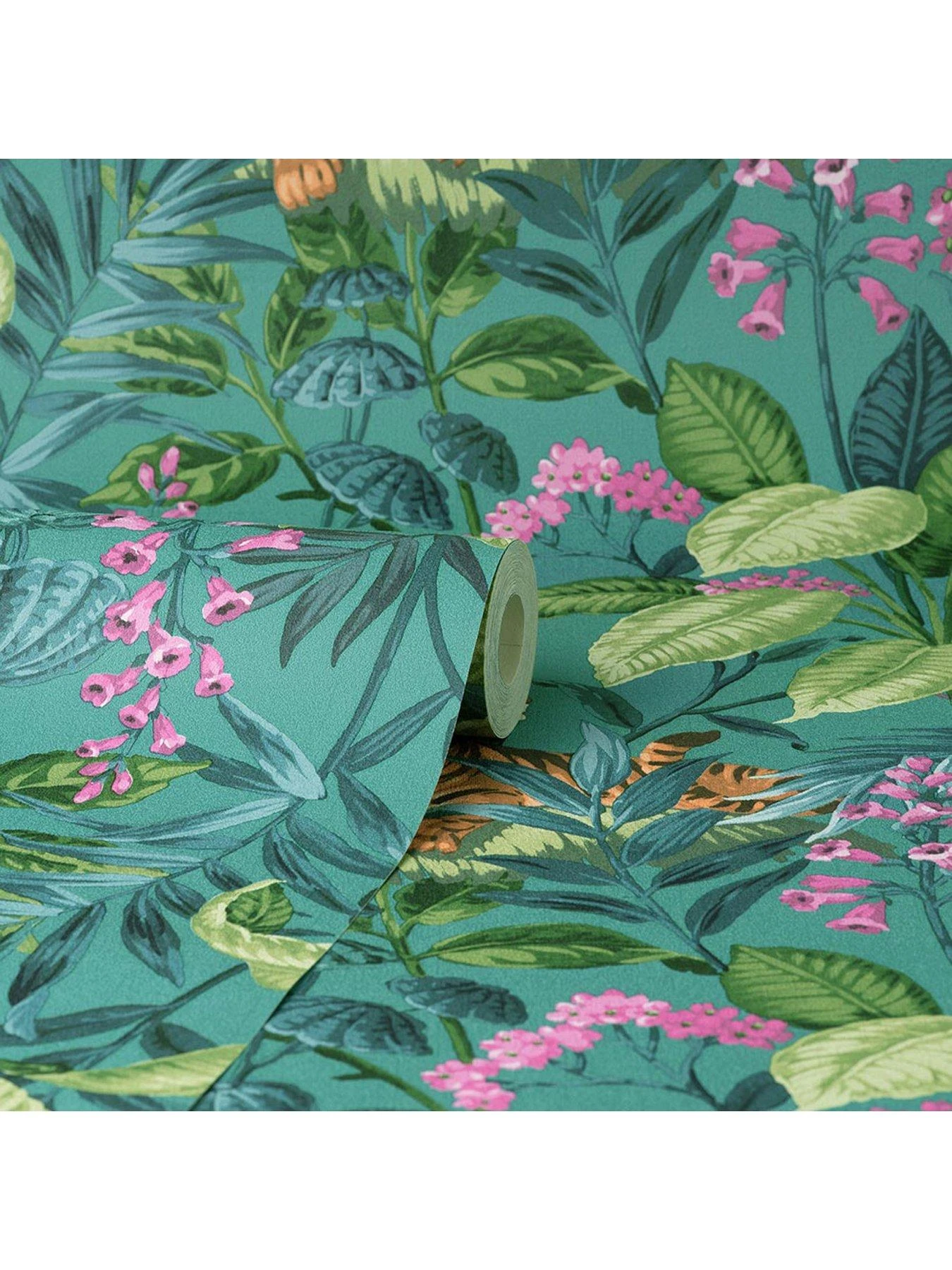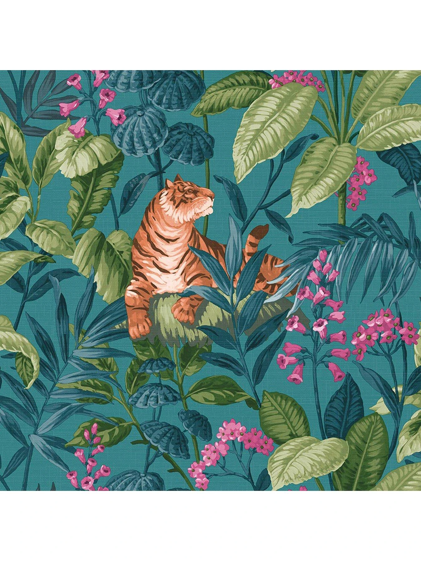 Perfect for contemporary spaces, the bold teal canvas plays host to a hand-painted scene featuring a resting tiger nestled amongst exotic flowers and vivid foliage. The vibrant palette makes this paper perfect for building a feature wall in a lounge, dining room or sleep space, and it’s printed onto linen-effect vinyl for added durability.