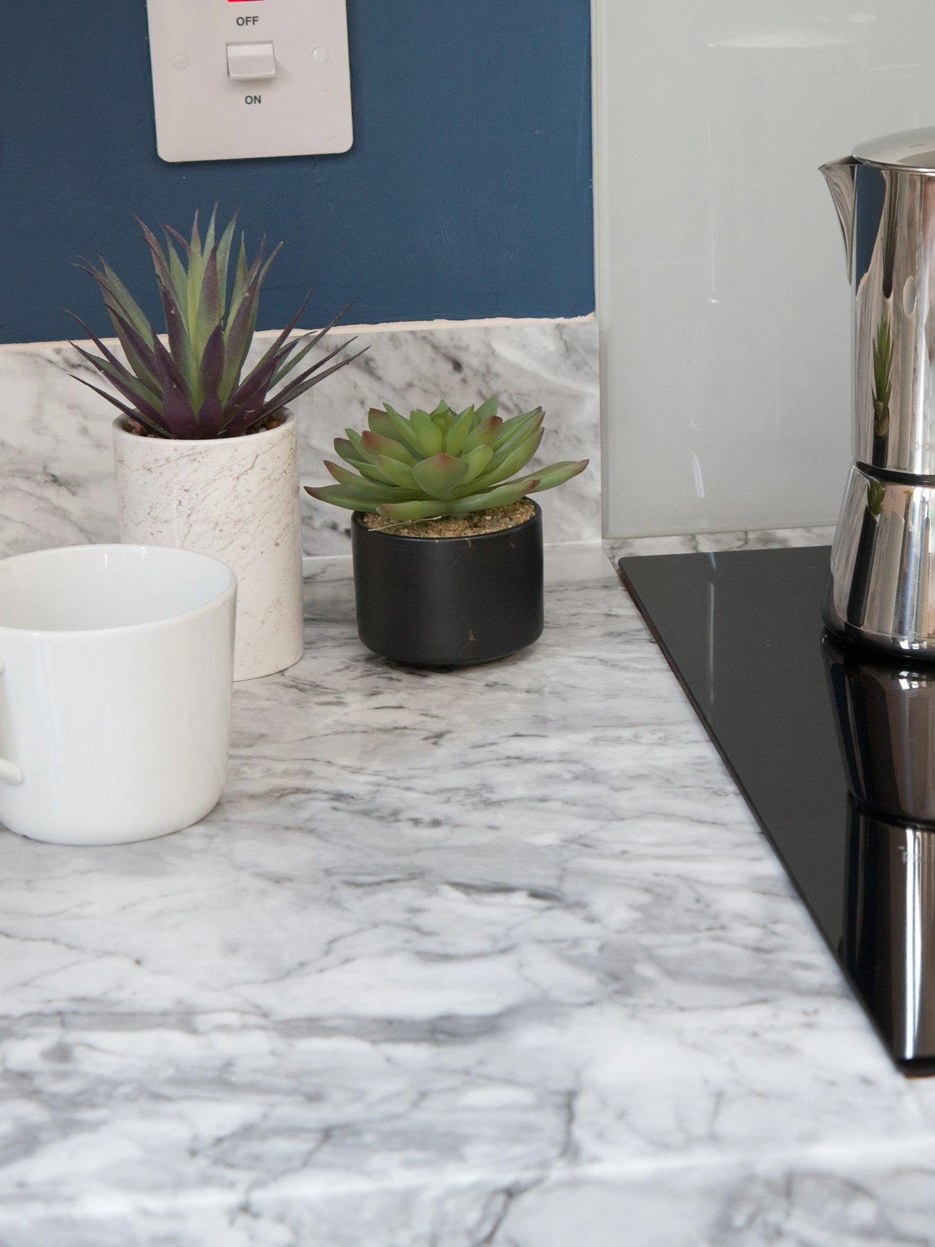 Quick and easy to apply to clean, smooth flat surfaces, simply remove the backing paper little by little, smooth into place using a dc fix smoother, moving from one side to the other to eliminate any air bubbles that may have formed. If you make a mistake, peel back and start again. The film is heat resistant to 75C so OK for hot cups and plates, but not hot pans, always use worktop savers to protect the vinyl and keep at least 12 inches away from naked flames – not to be used as a splashback behind hobs. Use sealant around sinks and hobs to make it water tight, a hairdryer can be used on curved edges to make the vinyl more pliable, careful not to stretch it.