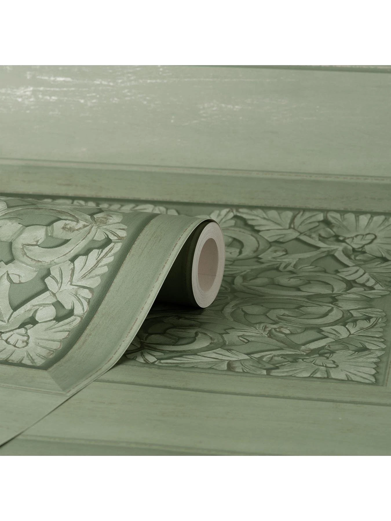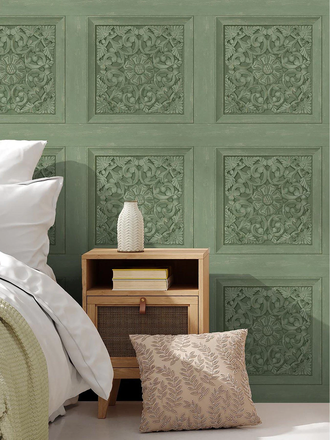 Create a sense of opulence with this beautiful carved wooden decorative panelling wallpaper. The depth of the relief effect is captured with an accent highlight in brushed metallic, and the subtle touch of wood grain is showcased in 3 trend colours of the season, a perfect addition to any home interior.