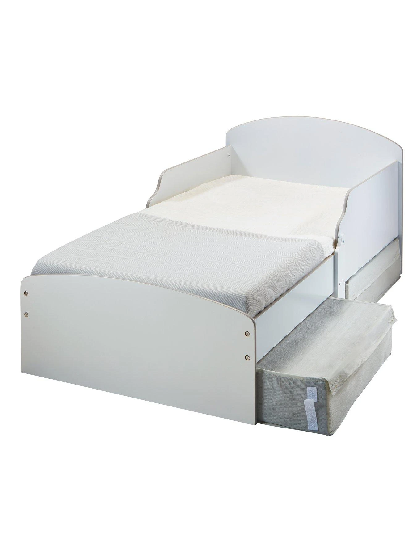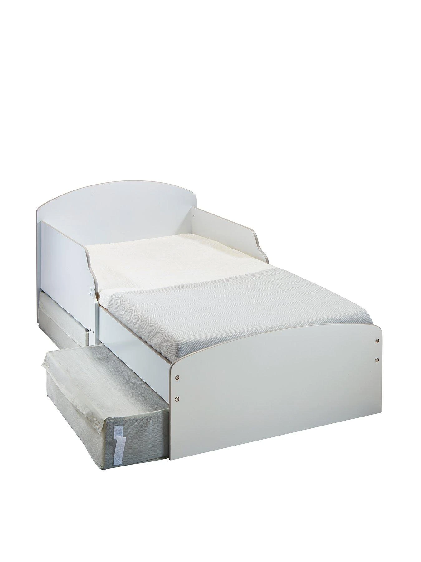Snug, safe, and fit for your littles ones first move into a big bed, this classic design white toddler bed with two grey fabric underbed storage drawers are the perfect transition from a cot to first big bed.