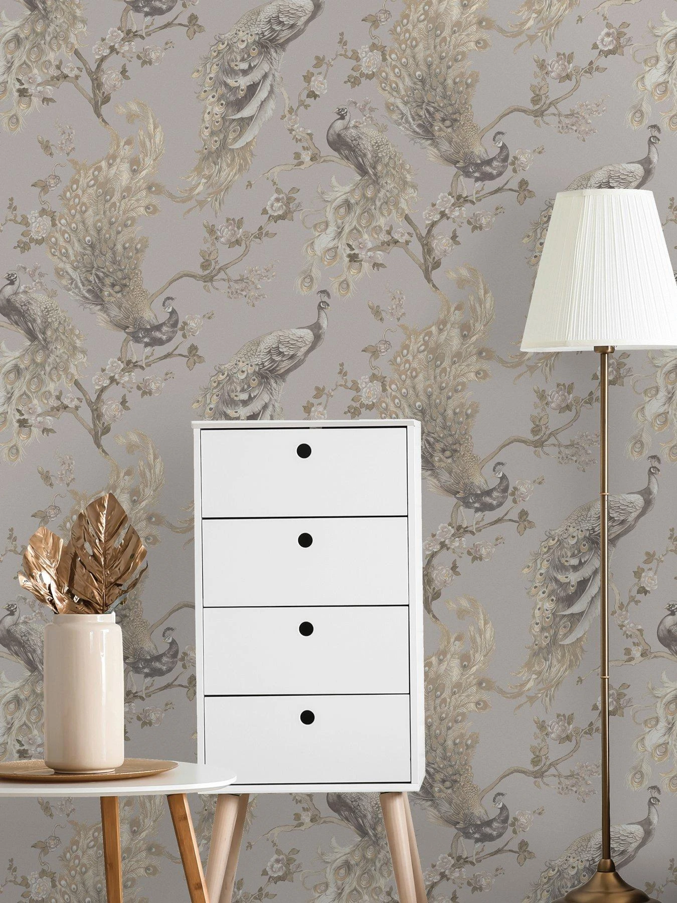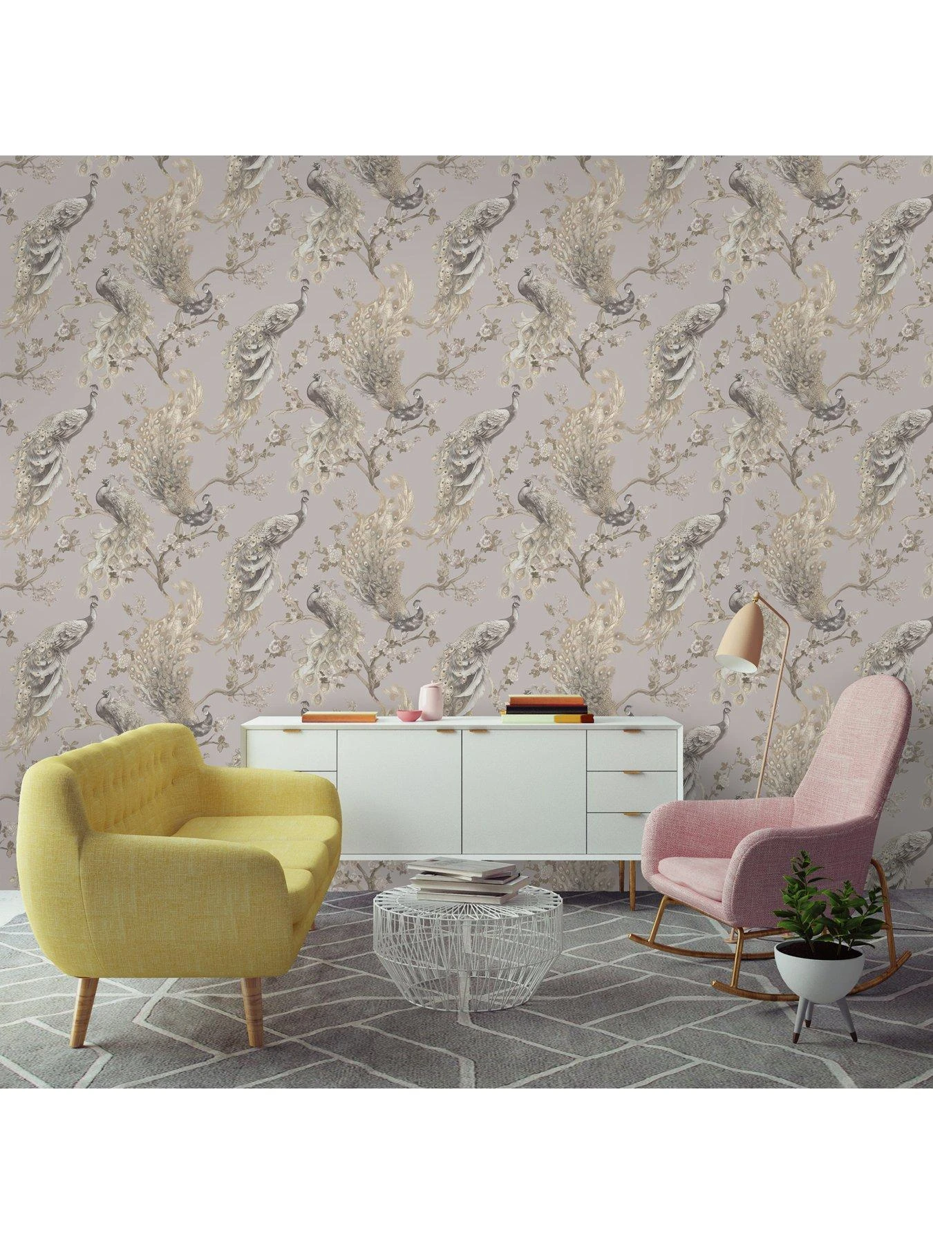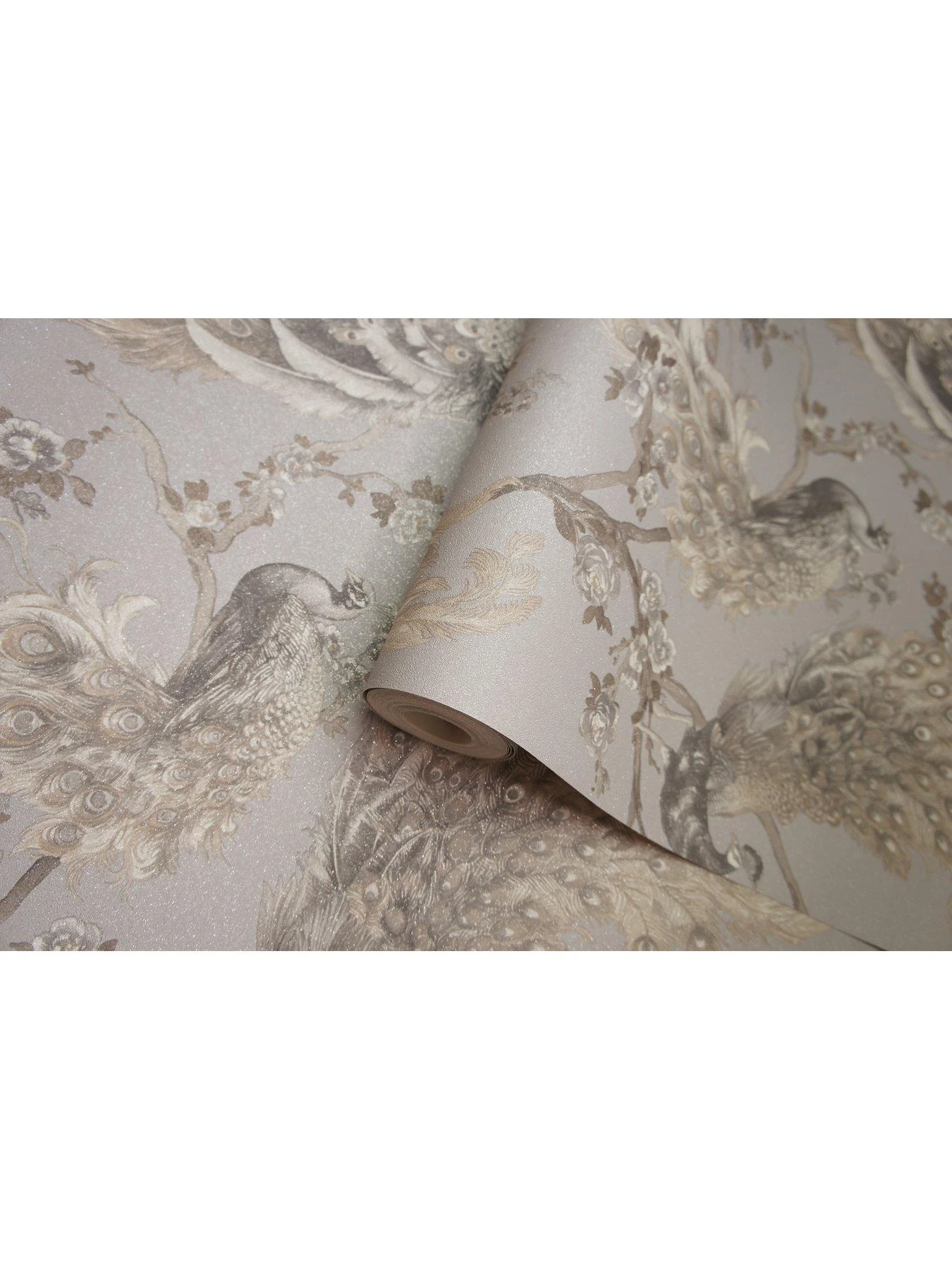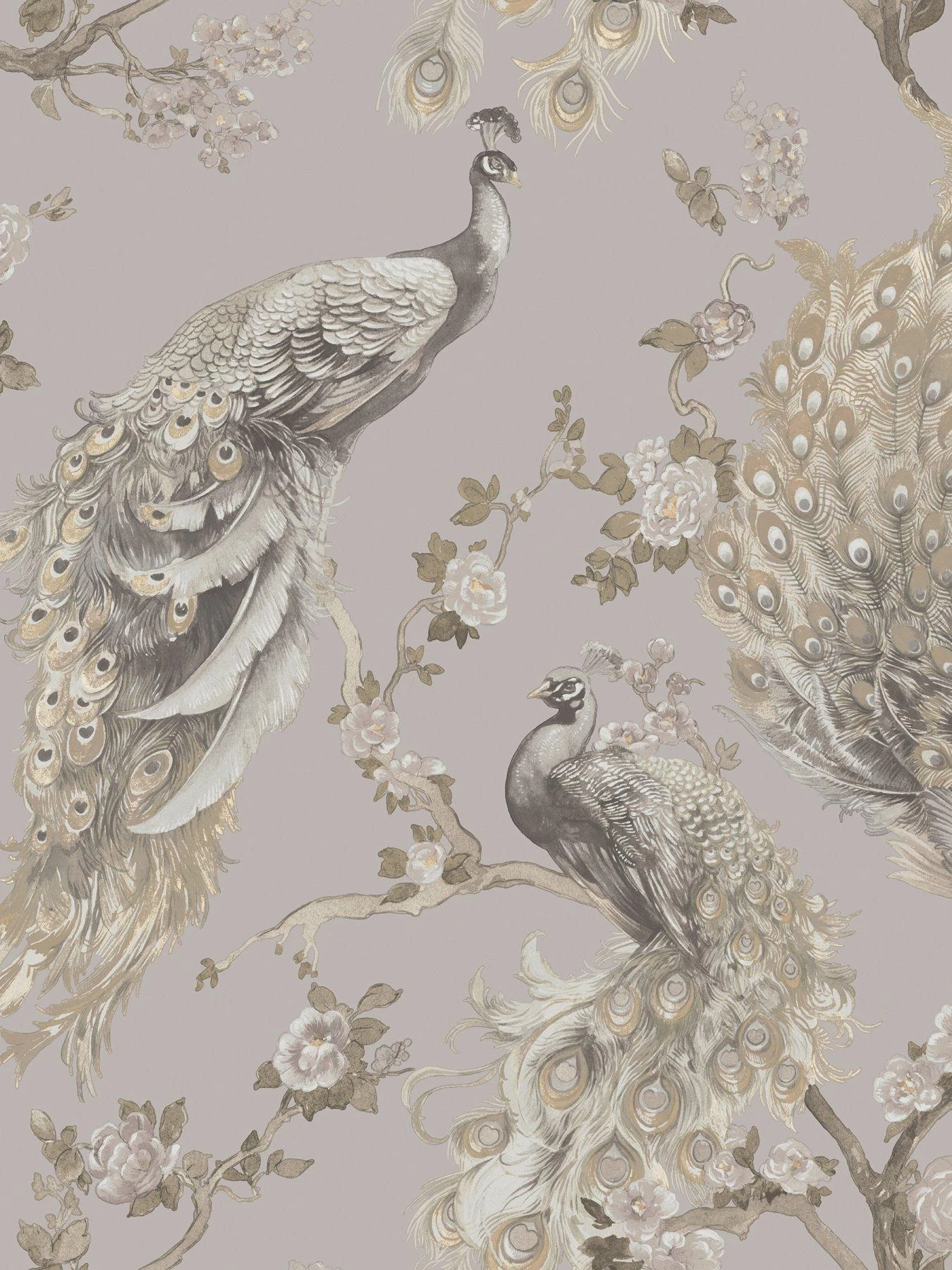 In grey, the classic backdrop has been elevated by the addition of detailed peacocks evenly spaced throughout. Pretty pops of pink add depth to the effect, while the textured glitter canvas provides a subtly sparkling finish.