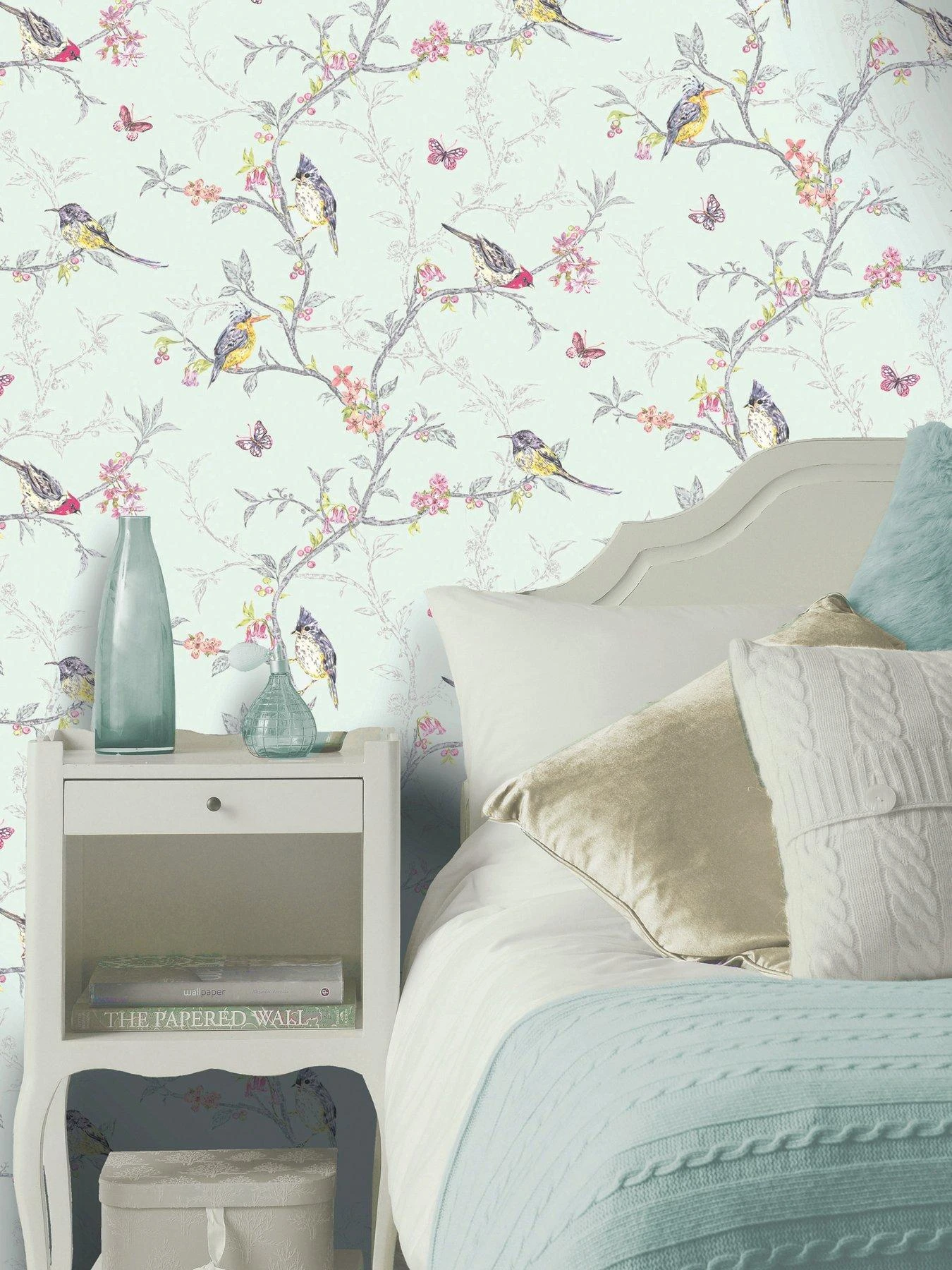 The soft teal background supports beautiful birds and butterflies amongst an intricate network of branches and flowers, all radiant in a palette of pretty pastel shades. The branches feature mica highlights in silver to add some shimmer, and it’s printed on durable heavyweight paper that’s also spongeable for easy cleaning of minor marks.