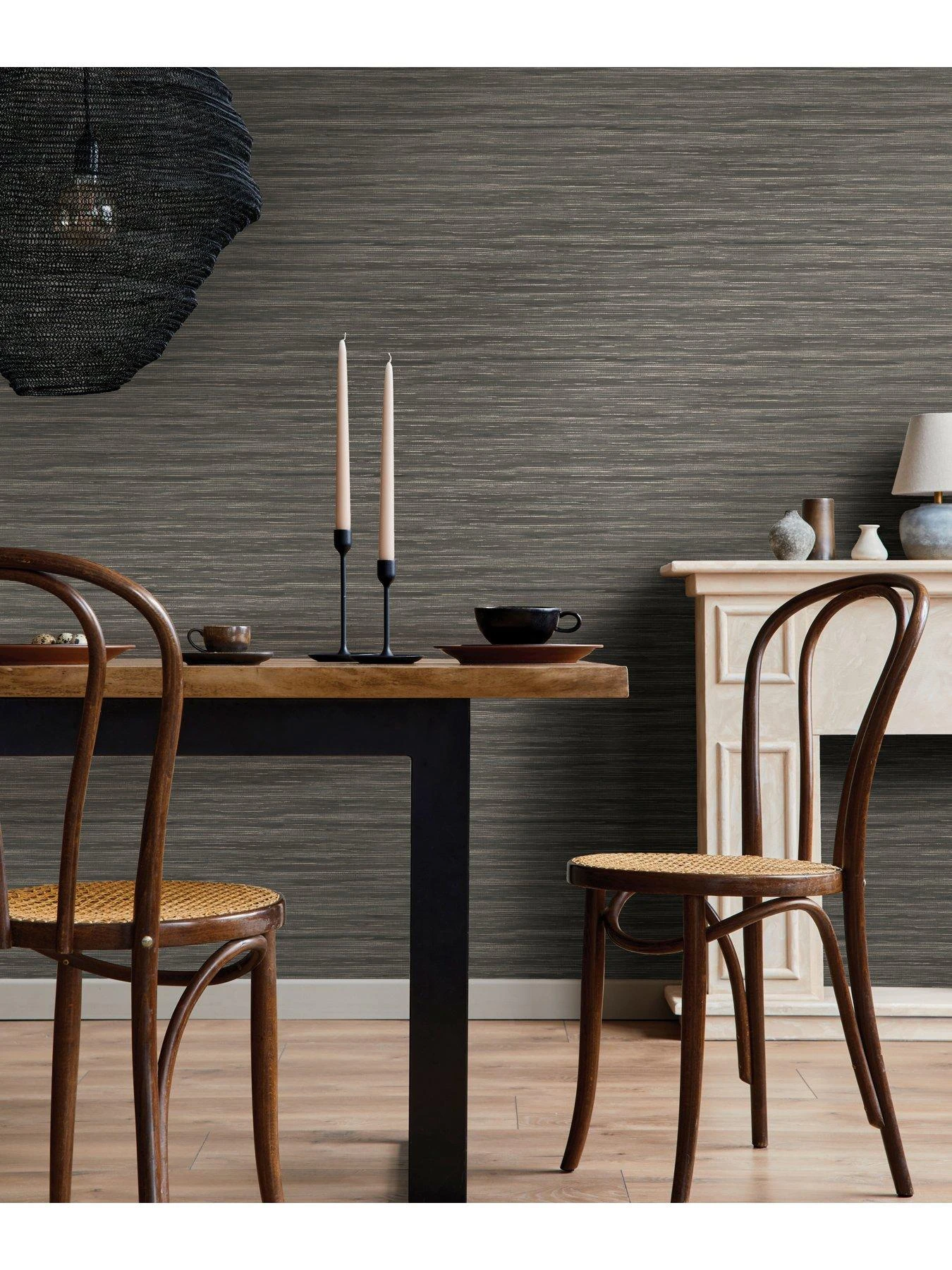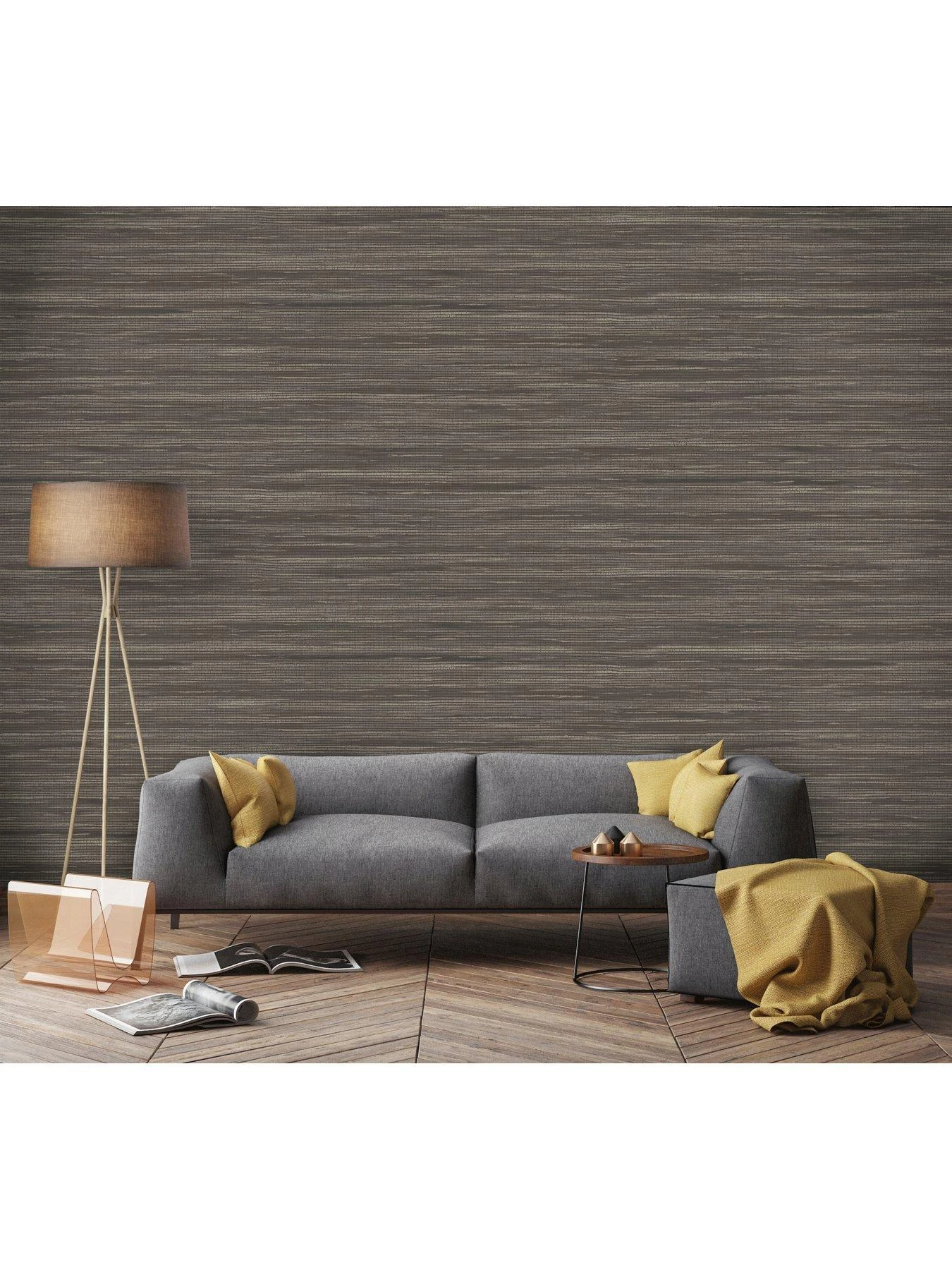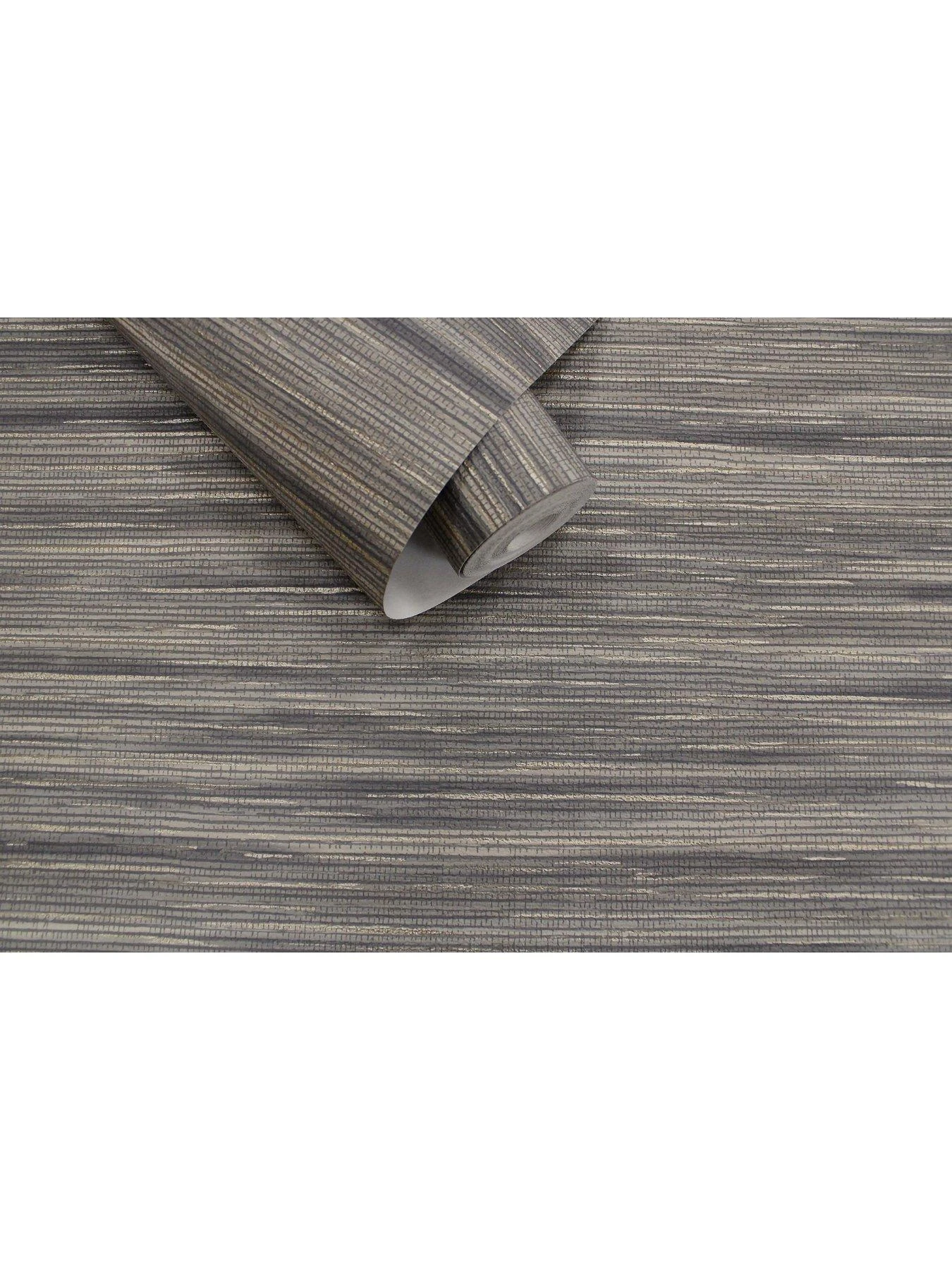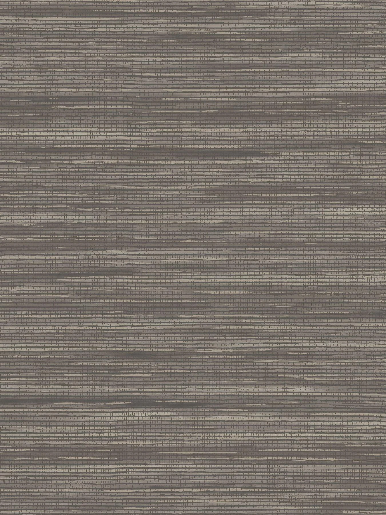 Designed by Holden Décor, the charcoal colourway uses subtle striping to replicate the look of grasscloth and other natural fabrics. Embossing builds depth in the design, while metallic highlights add dimension to the look.