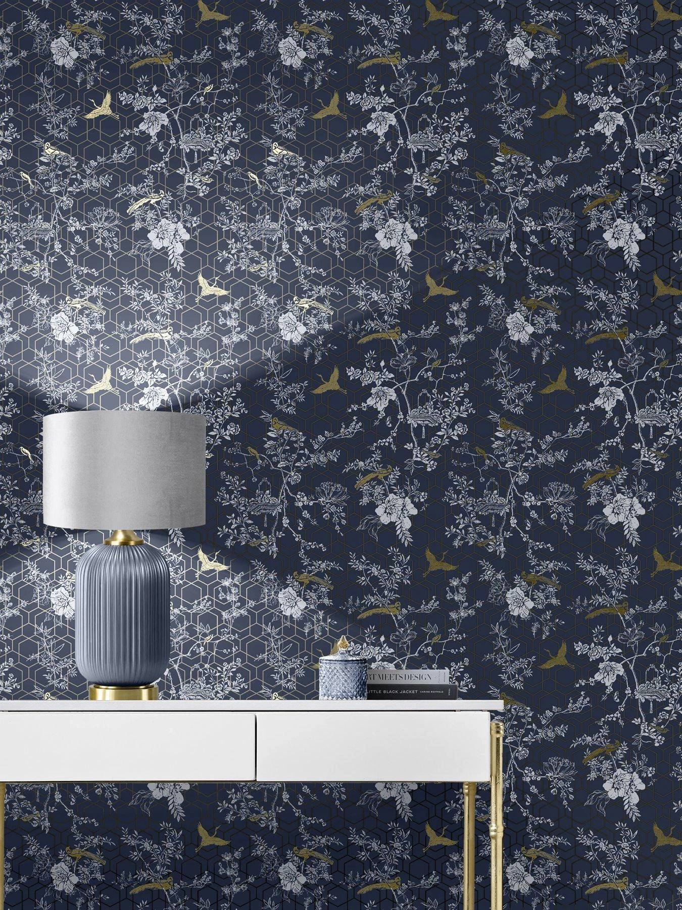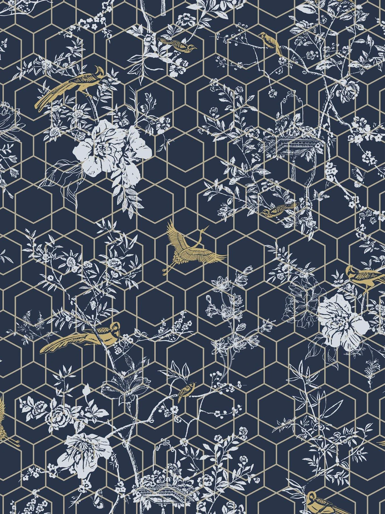 Himara is a luxurious Chinoiserie print which brings a touch of exoticism and timeless charm to interiors. An interpretation of Eastern artistic traditions, Himara is characterized by beautiful stylized flower and bird motifs combined with a metallic geometric print.