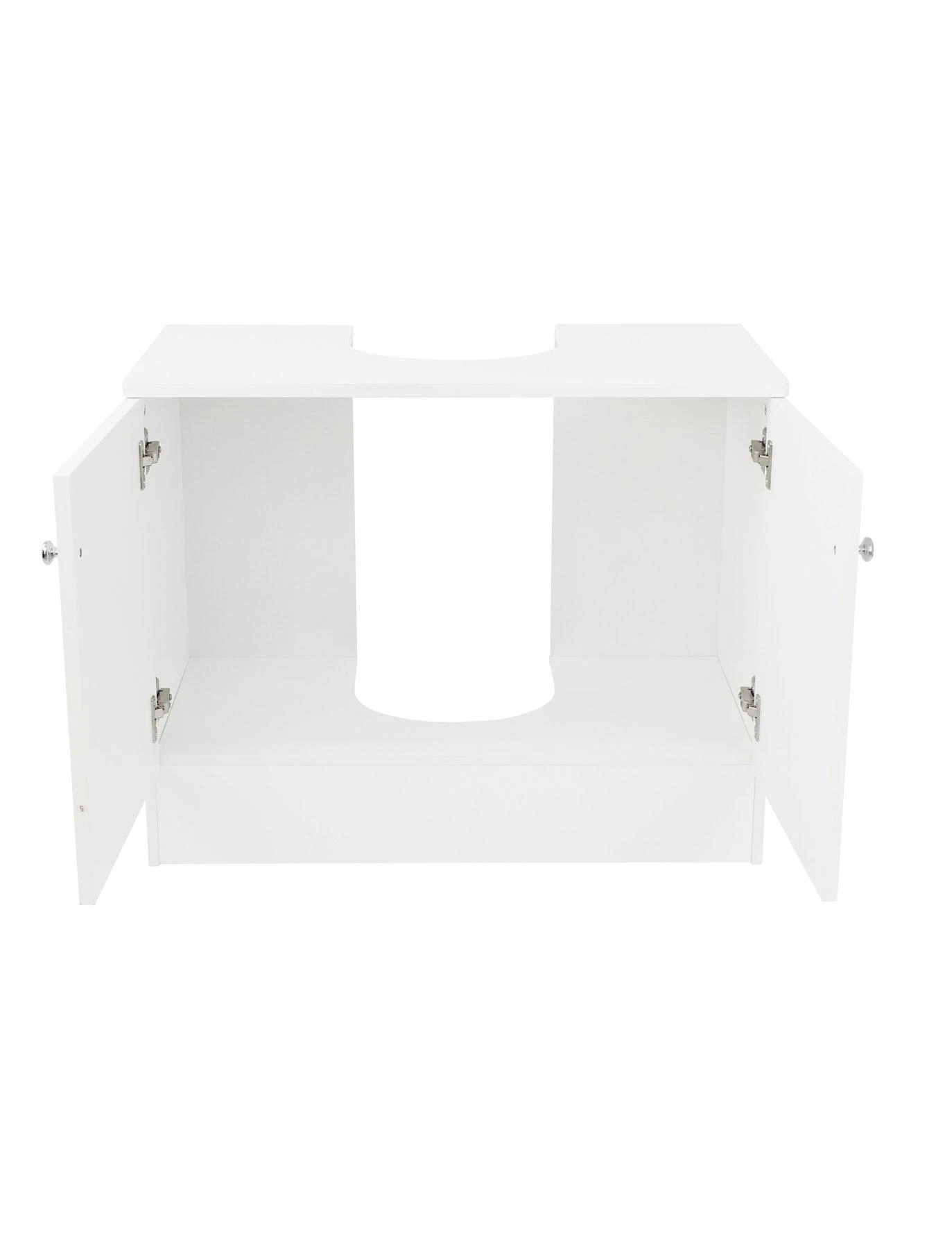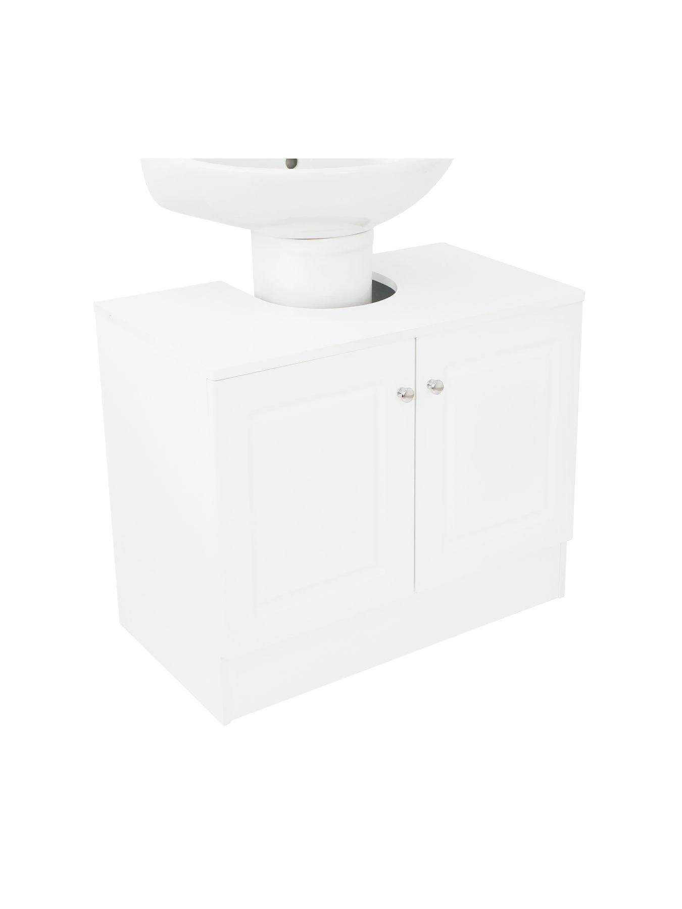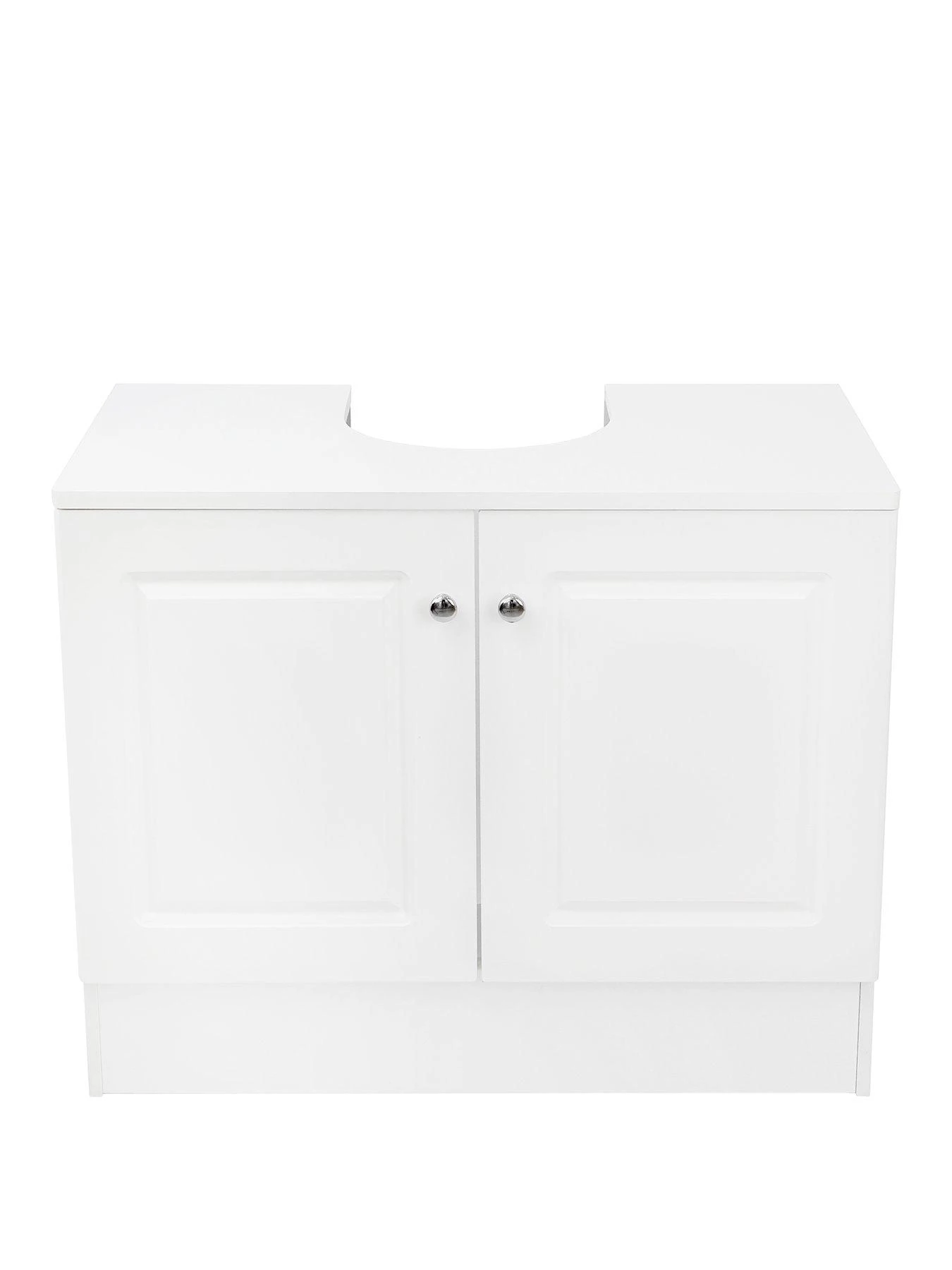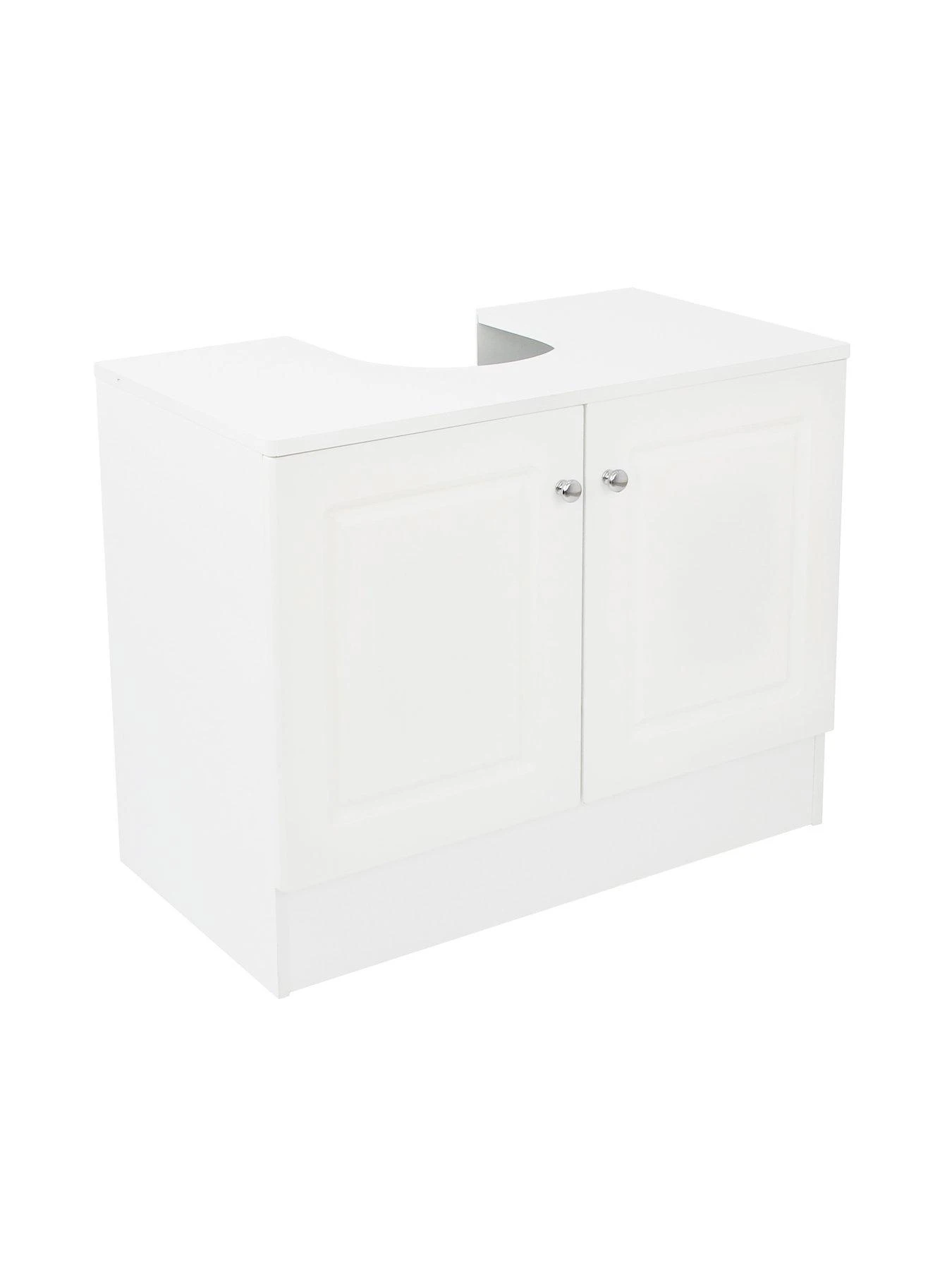 Finished in a breezy painted white shade, it feature 2 decorative routed doors and slots neatly around the sink’s pedestal. It’s finished with dainty metal knob handles and provides plenty of storage room for everything for spare loo rolls to cleaning products.