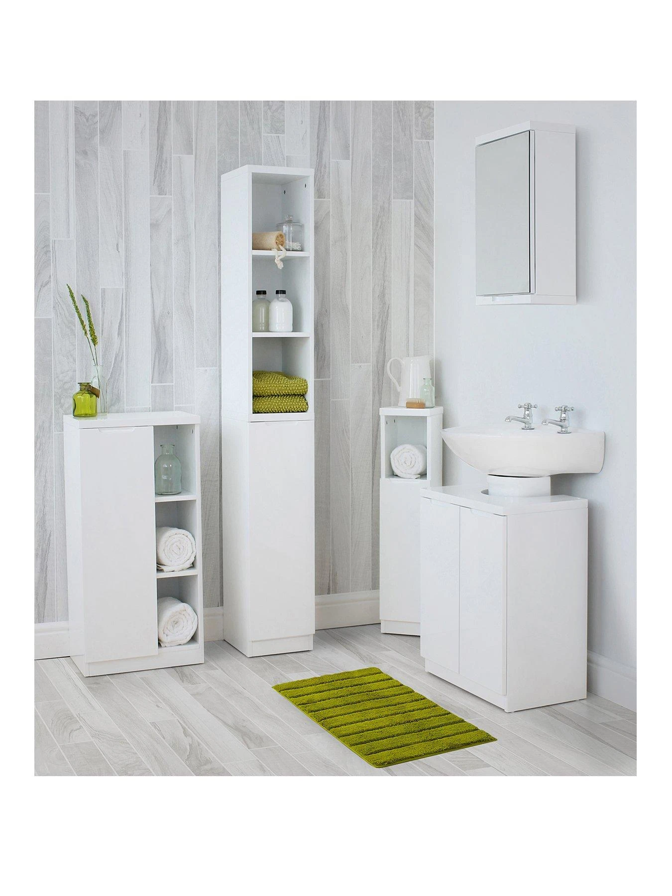 The bottom half of the unit has a cupboard with a single door that features a fashionable cut-out handle. Behind it you’ll find 3 shelves for stowing away everything from cleaning essentials to spare toilet rolls.
