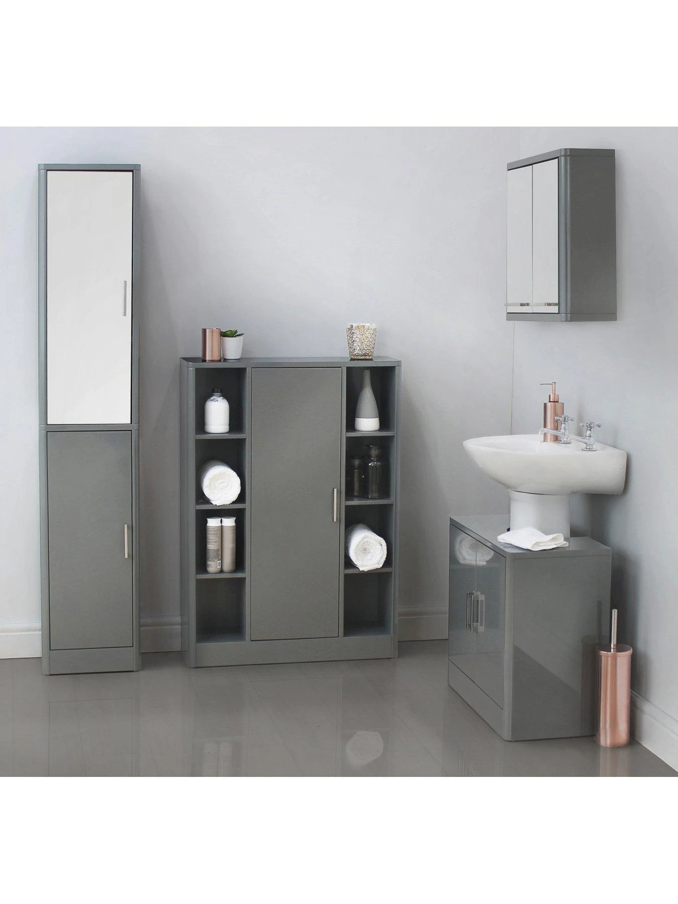 Our Lunar collection is an easy way to reinvent your bathroom or en suite’s style and storage space. Boasting sleek lines, curvy corners, polished chrome handles and a shiny hi-gloss finish, its grey colourway will match a wide variety of decors.