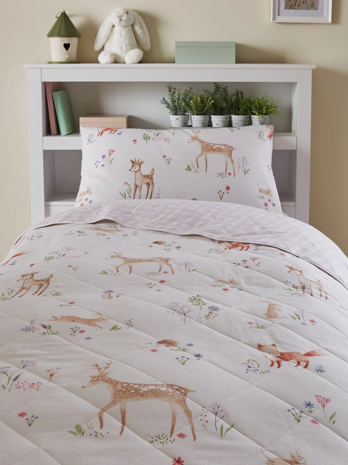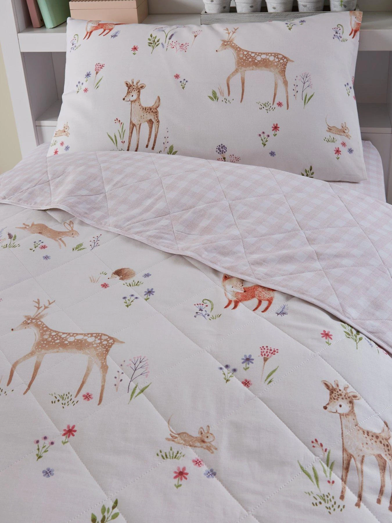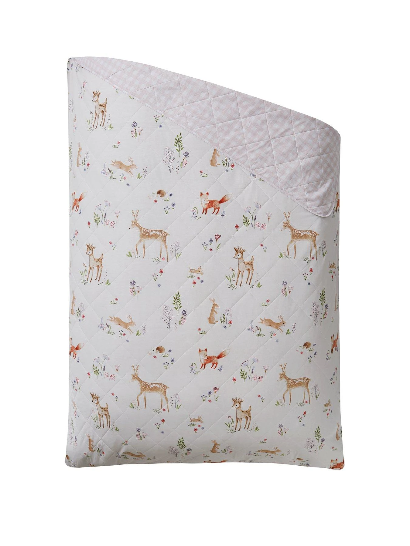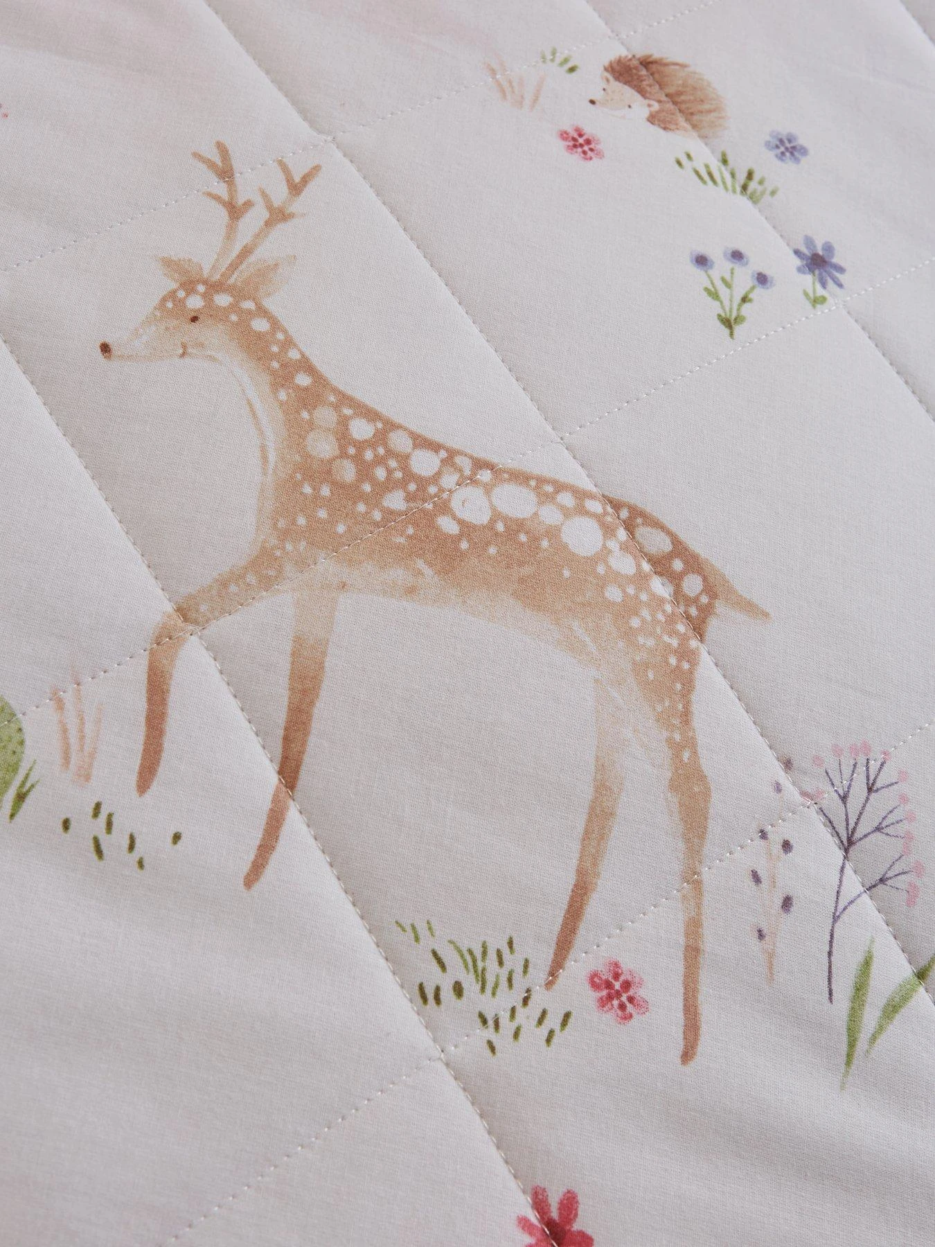 Its natural canvas is adorned with a gorgeous print featuring woodland animals all over. Hares can be spotted hopping over country flowers, little foxes are prancing around, and there are even a few baby deer to be spied. It’s all elevated by the addition of stylised wildflowers in shades of green and lilac.