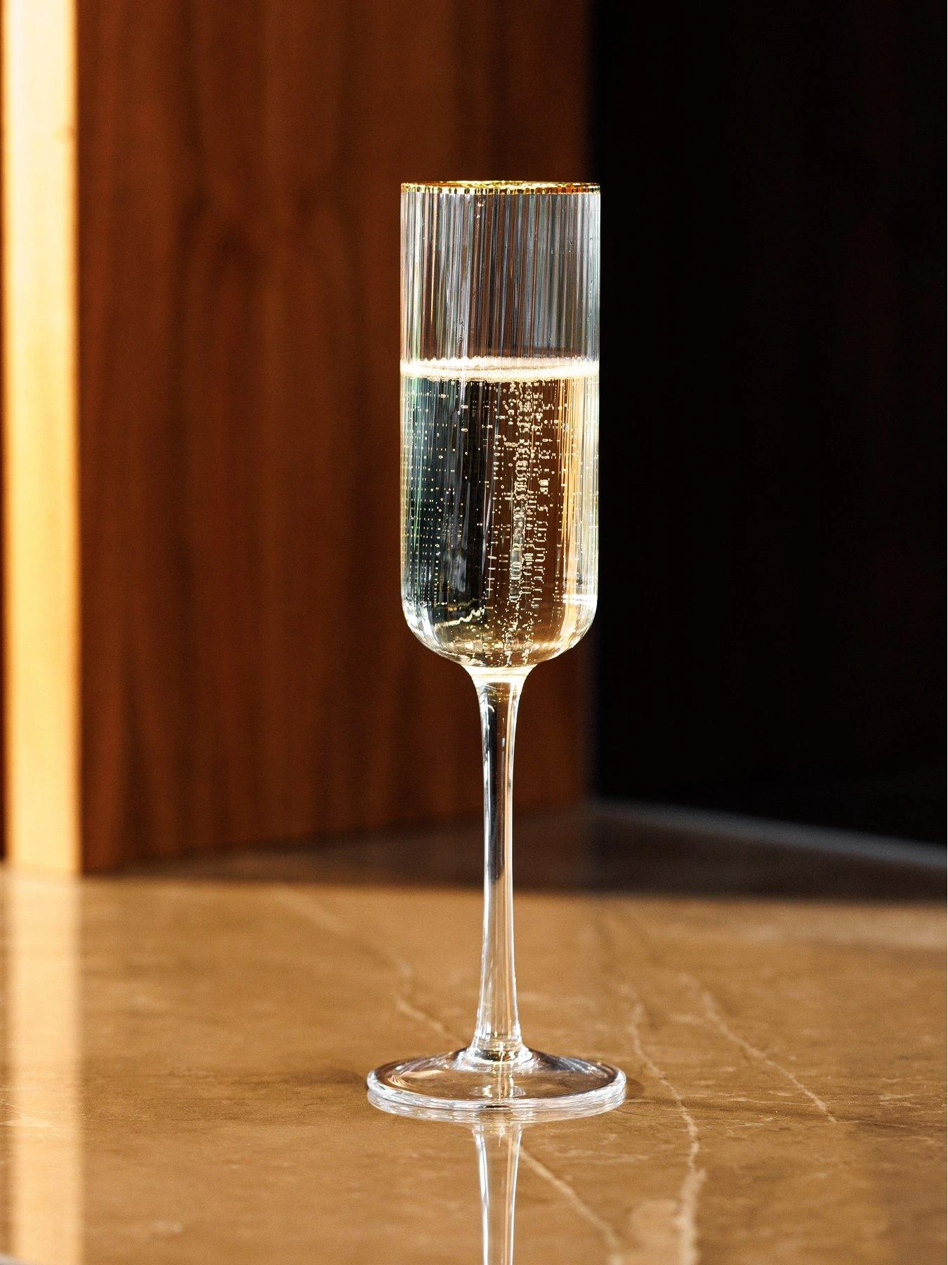 Each 200ml Champagne flute is adorned with a ribbed pattern, set in perfectly clear crystal glass, which shimmers beautifully under light. Finished with a gold rim on top, the glasses exude refined sophistication. The Sorrento collection is ideal for special celebrations and sits perfectly on any tabletop, adding an extra touch of elegance to any occasion.