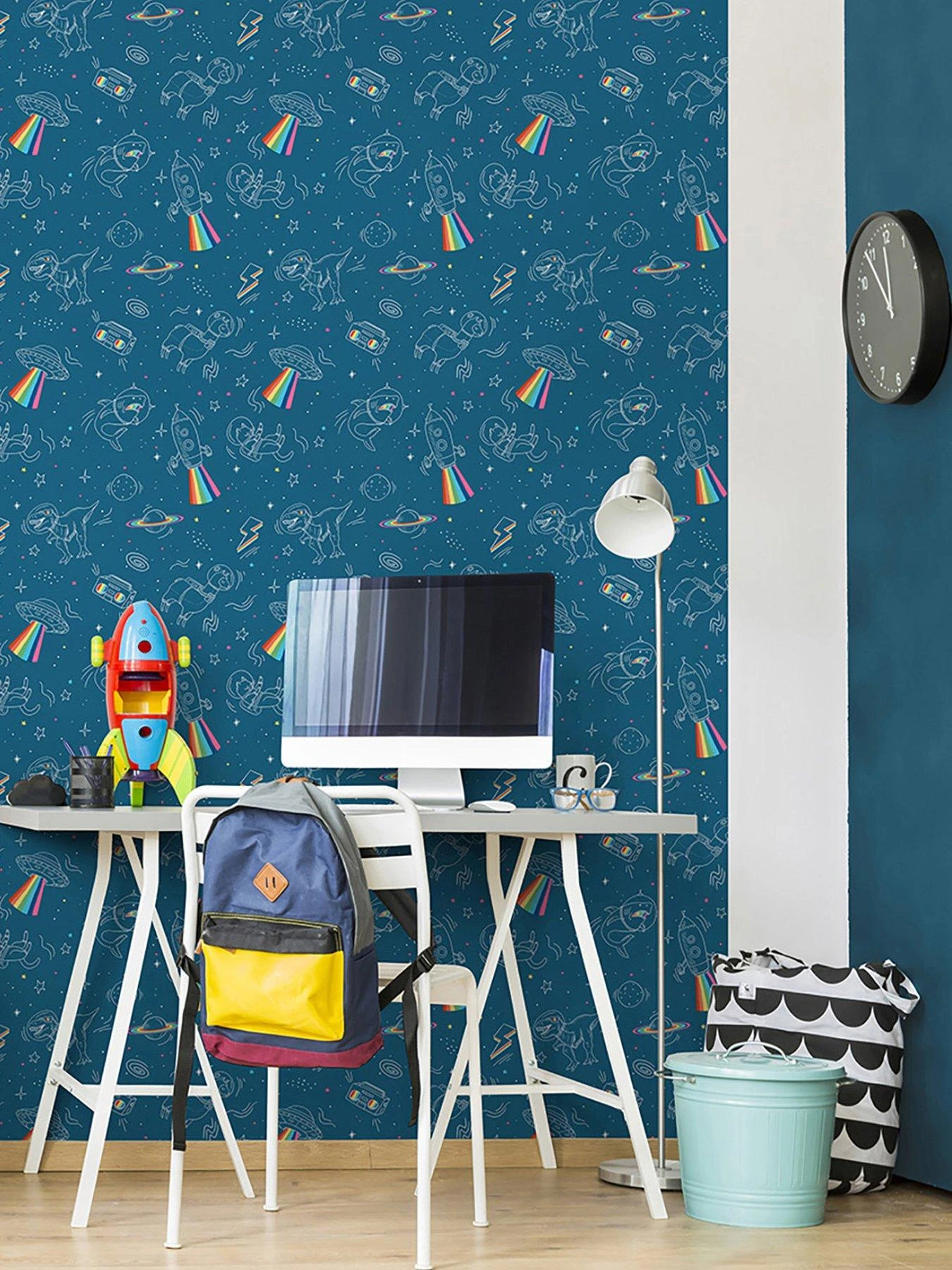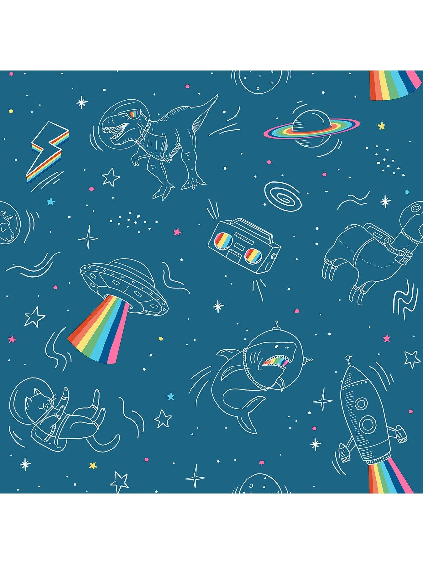 Wow! This design couldn’t get any more fun. Take a trip to space with a T-Rex, UFO and a llama. Bright colours and flashes of rainbows make this a bright and colourful wallpaper.