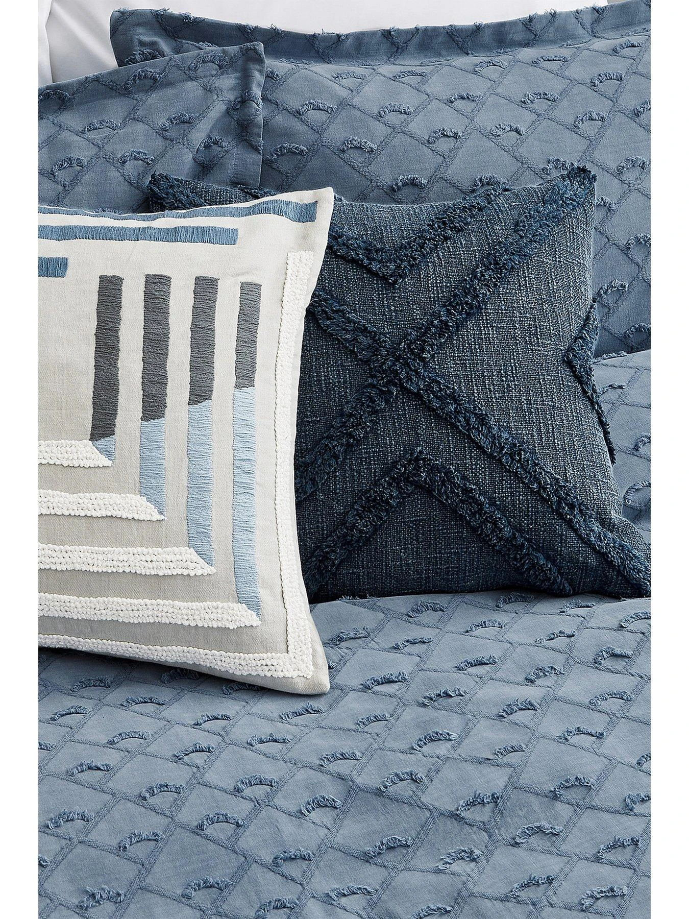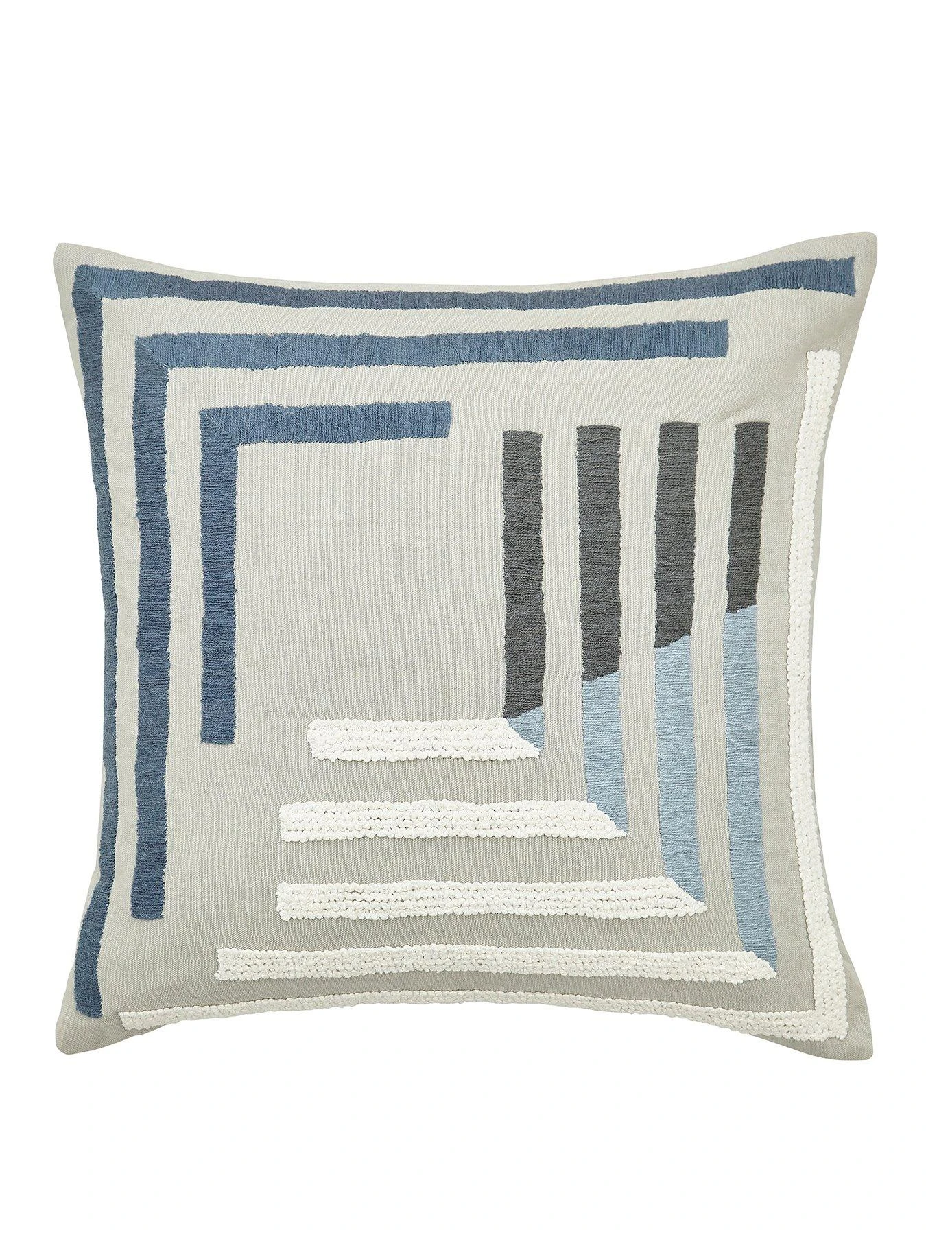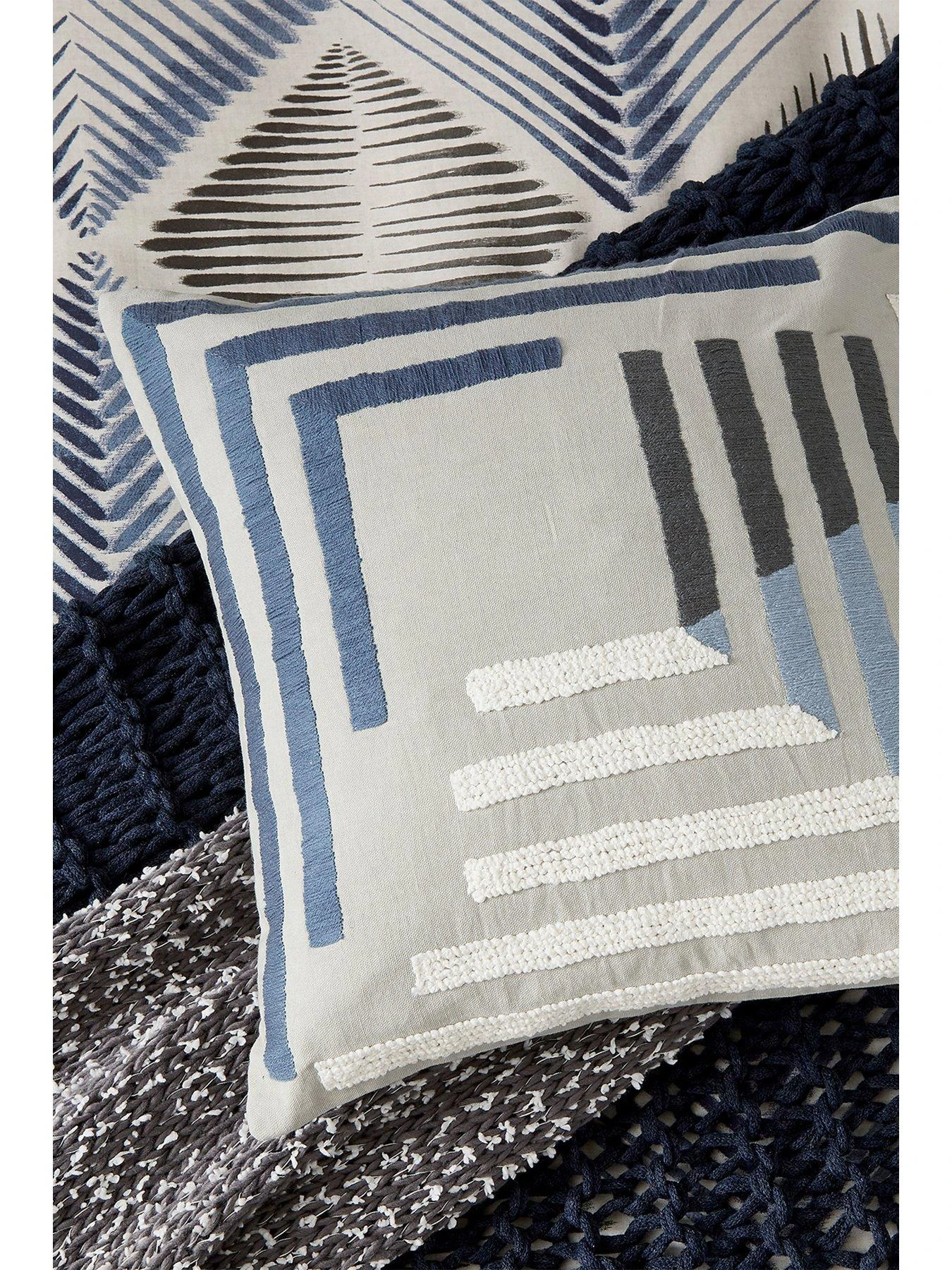 The naturally-toned 100% cotton base is embroidered with a gorgeous geometric pattern in shades representing the sea and sand of paradise, as well as the starry night sky – blue, cream and charcoal. At 45 x 45 cm, it comes complete with a plump filler, so you can see the instant effect it offers.