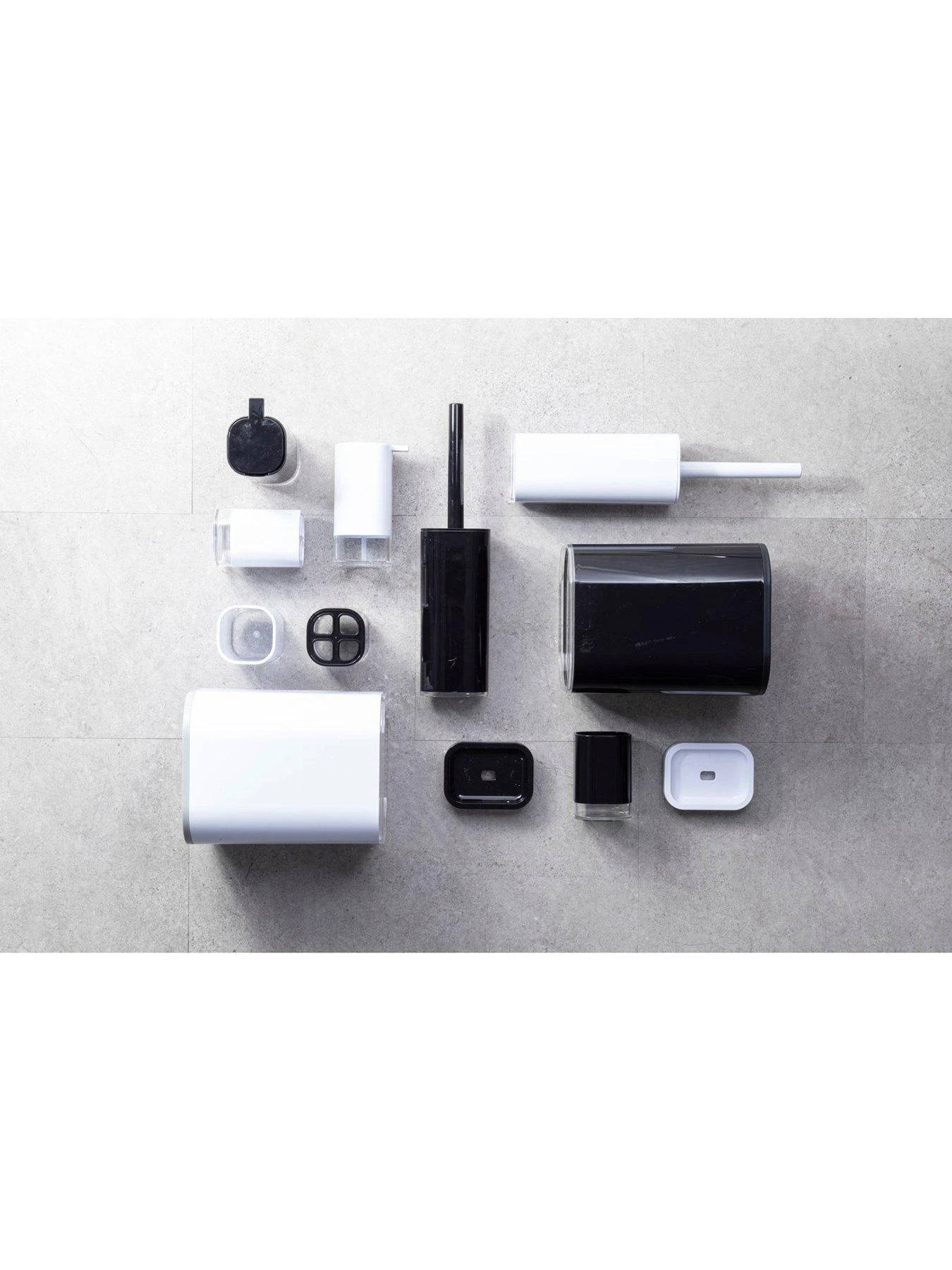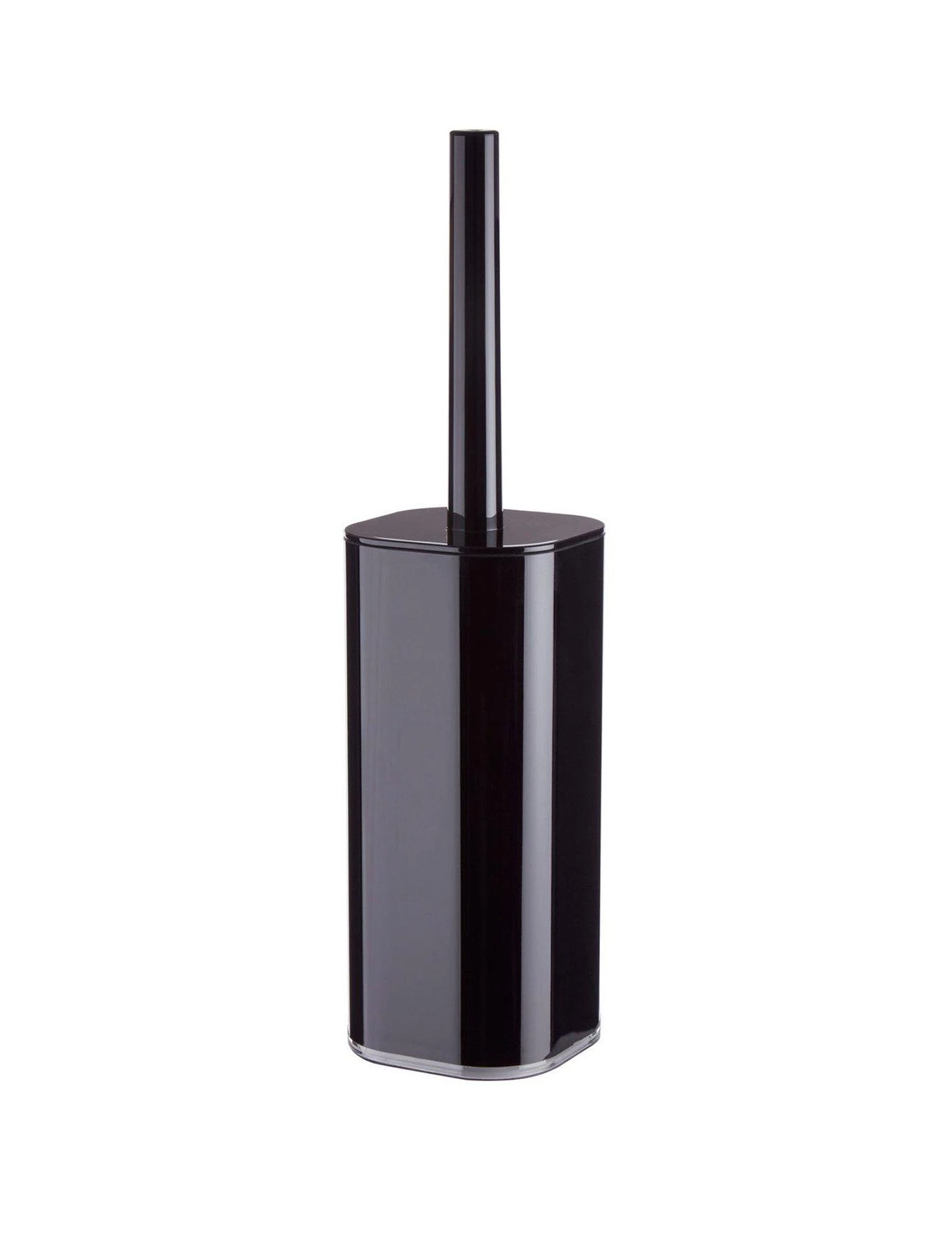 This cylindrical toilet brush holder is made from acrylic that lends it added strength. Featuring a deep black outer, it has a matching handle with a brush attached at its end that is covered with a snug lid.