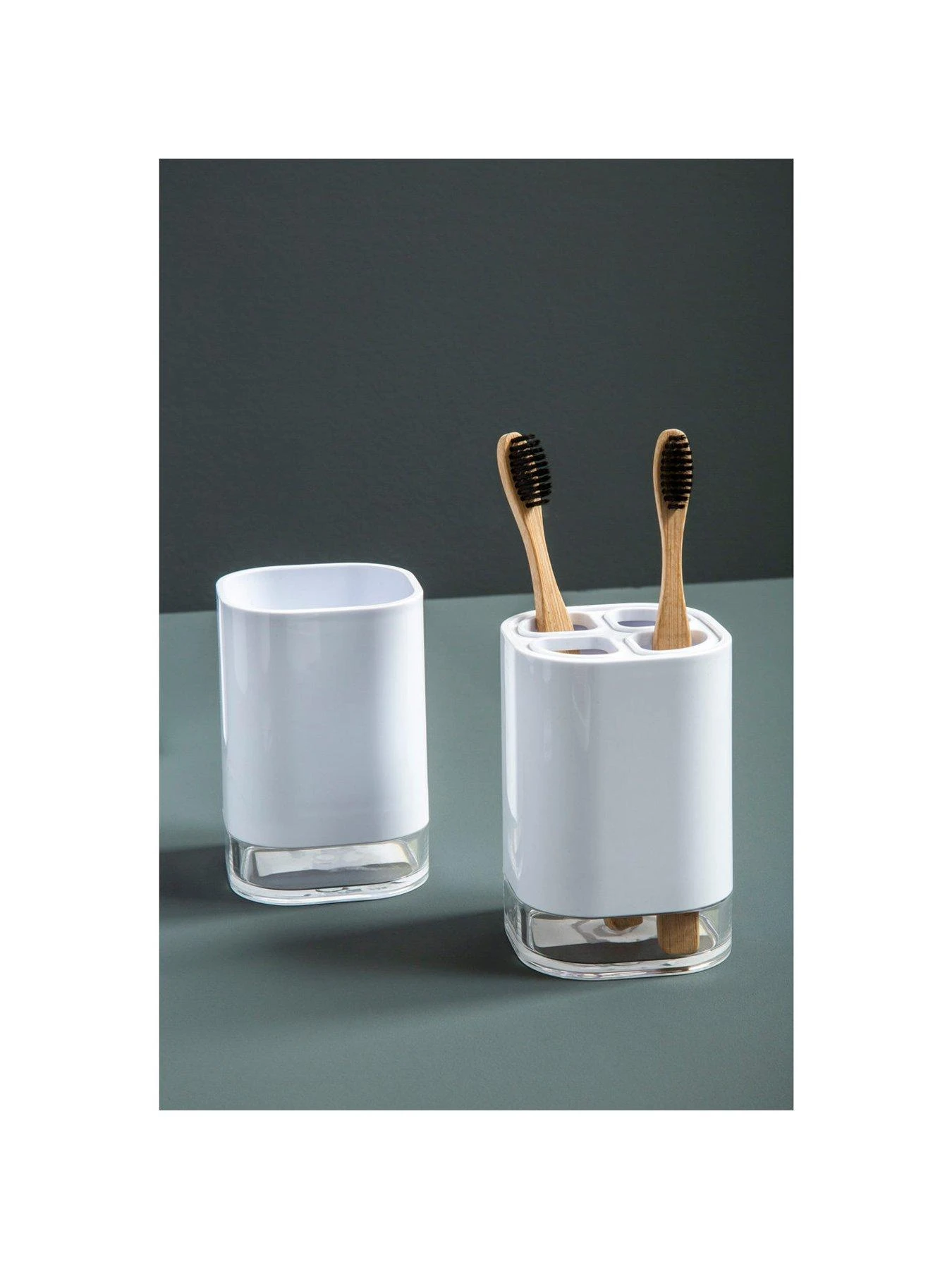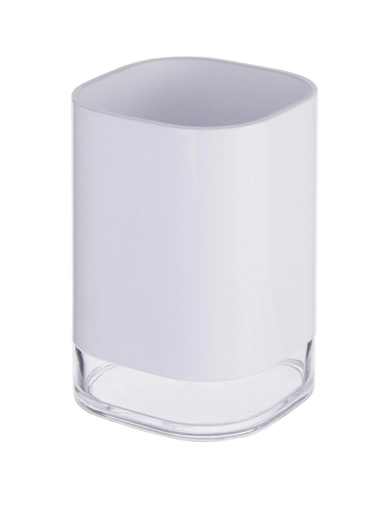 Made from white acrylic, this tumbler has curved sides featuring clean lines which contribute to its minimal aesthetic. It has an open design that allows storing toothpaste or toothbrushes while keeping the bathroom clean and organised.