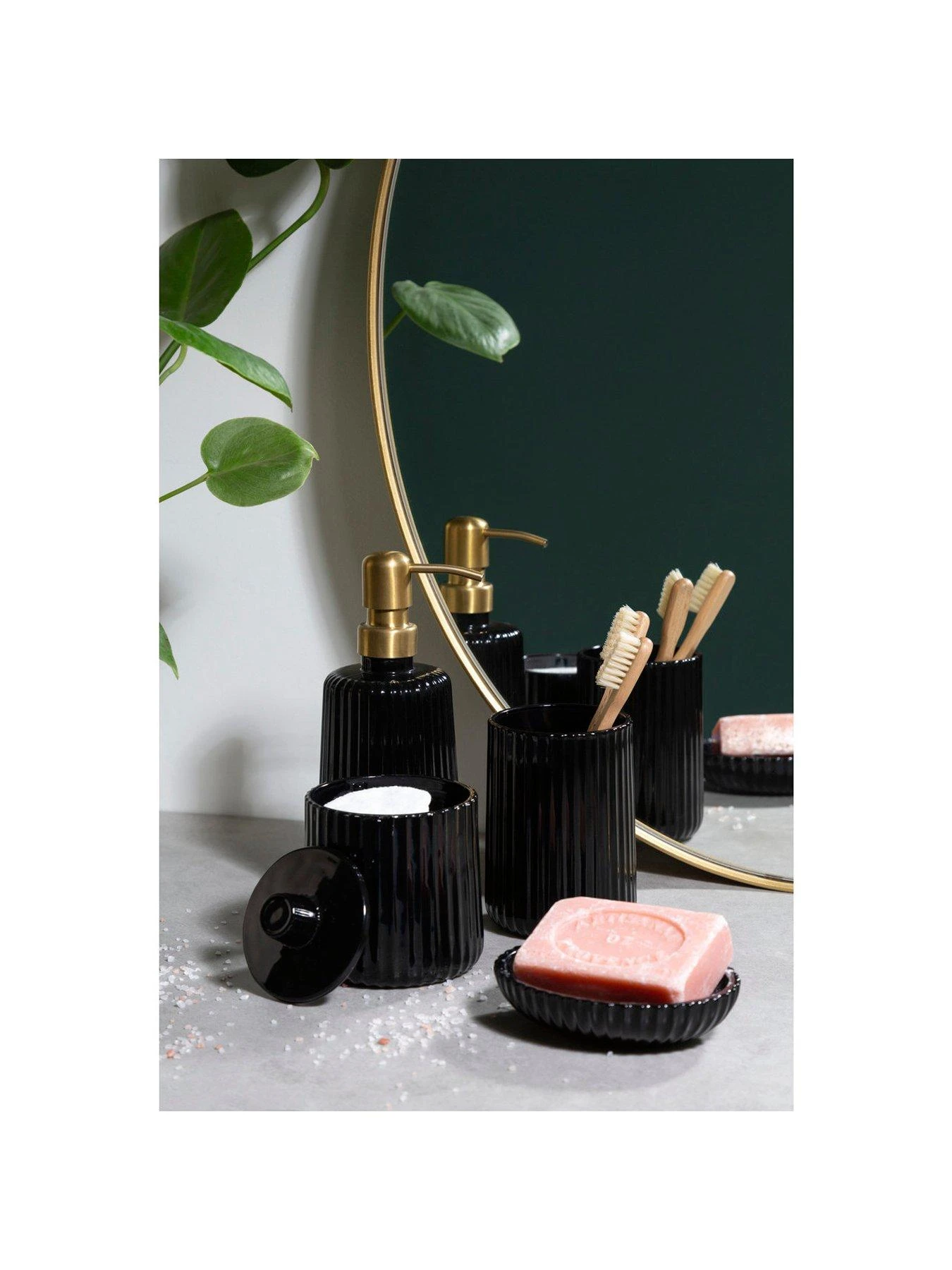 Made from black glass, the Ticino Brittany lotion dispenser’s tapered body features a textured vertical ridge pattern. The smooth, contoured pump top has a rich metallic brass finish, adding a touch of luxe design appeal.