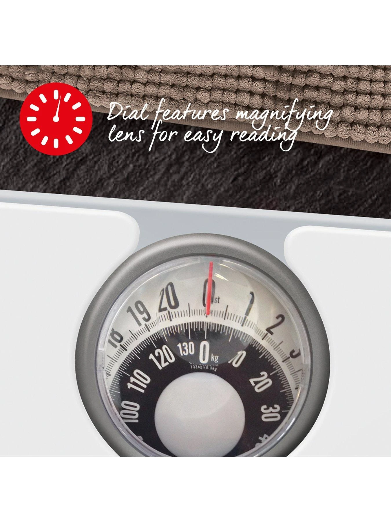 The mechanical scales feature a 12.5 cm analogue dial with a magnifying lens to make reading easy. The fine resolution of 0.5 kg (1 lb), meanwhile, allows you to get an accurate measurement. With a maximum weight of 133 kg (21 st lb), the scale platform also flaunts a white cushioned mat that’s more comfortable on you feet, and the compact size means you can pop the set away when it’s not in use.