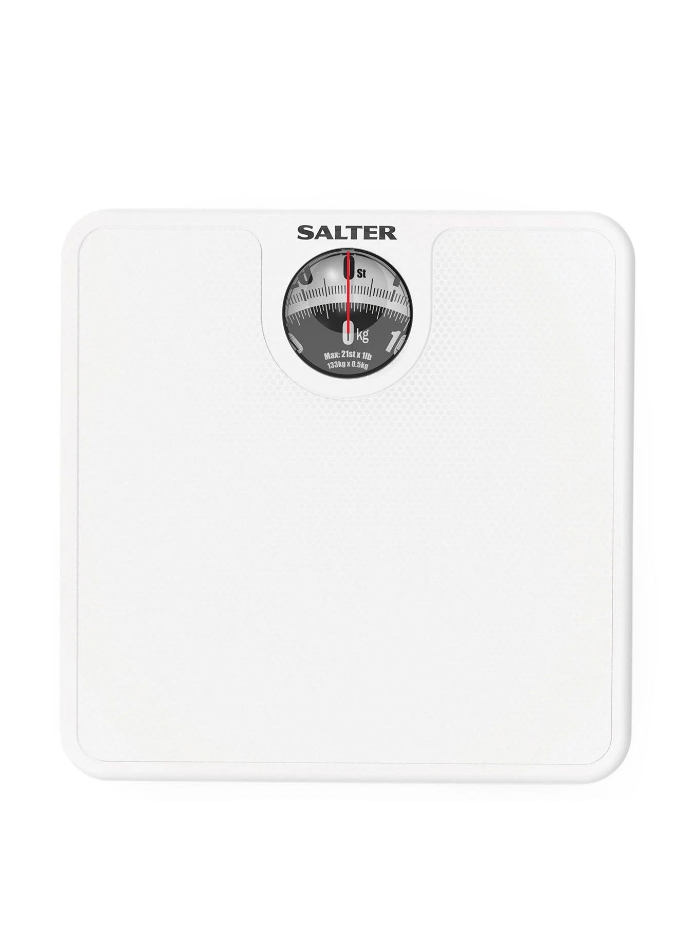 - Complete with an anti-slip mat and a powder-coated steel platform, these Salter mechanical scales have a maximum capacity of 133 kg.