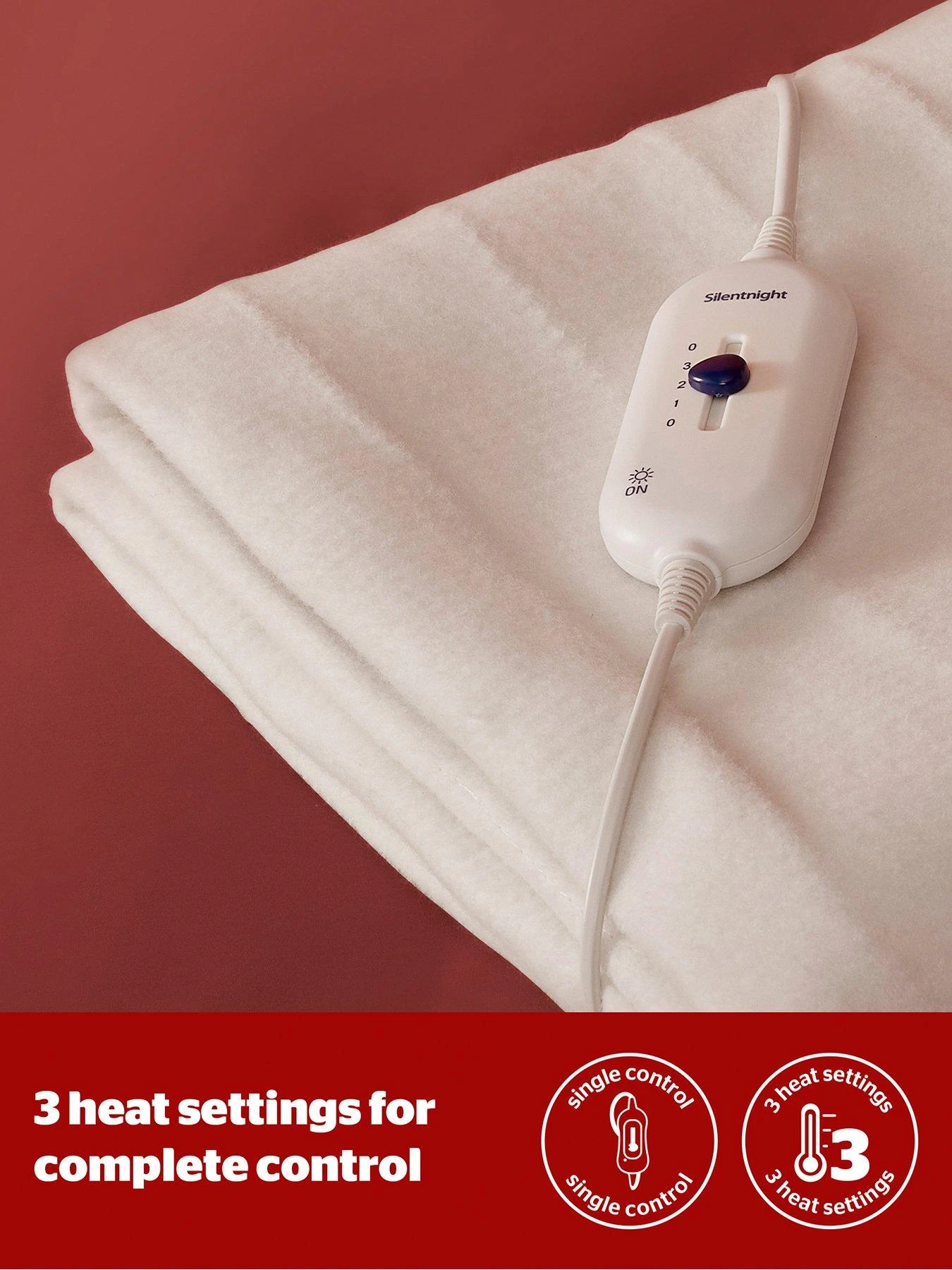 The Comfort Control Electric Blanket by Silentnight helps you to take complete control of your comfort and warmth. The electric blanket is made from 100% polyester which is soft to touch but durable, providing added comfort to your mattress. Featuring three heat settings that you can adjust to set the temperature that is just right for you.Â
