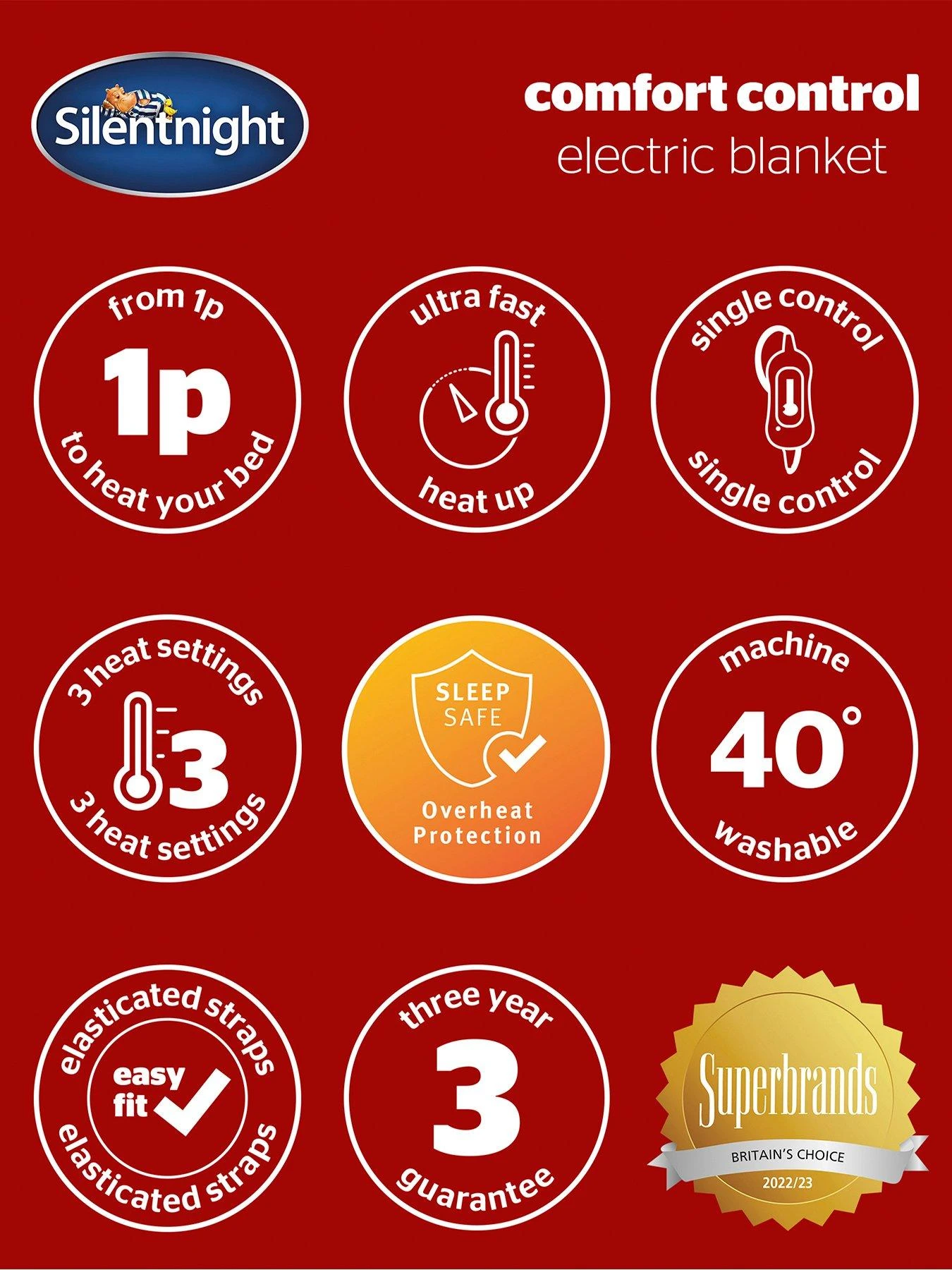 The Silentnight Comfort Control Electric Blanket is an energy efficient and affordable way to stay warm for less. Pre- heating your bed for 2 hours on a low heat setting costs as little as 1p, so you can afford to cosy up night after night.