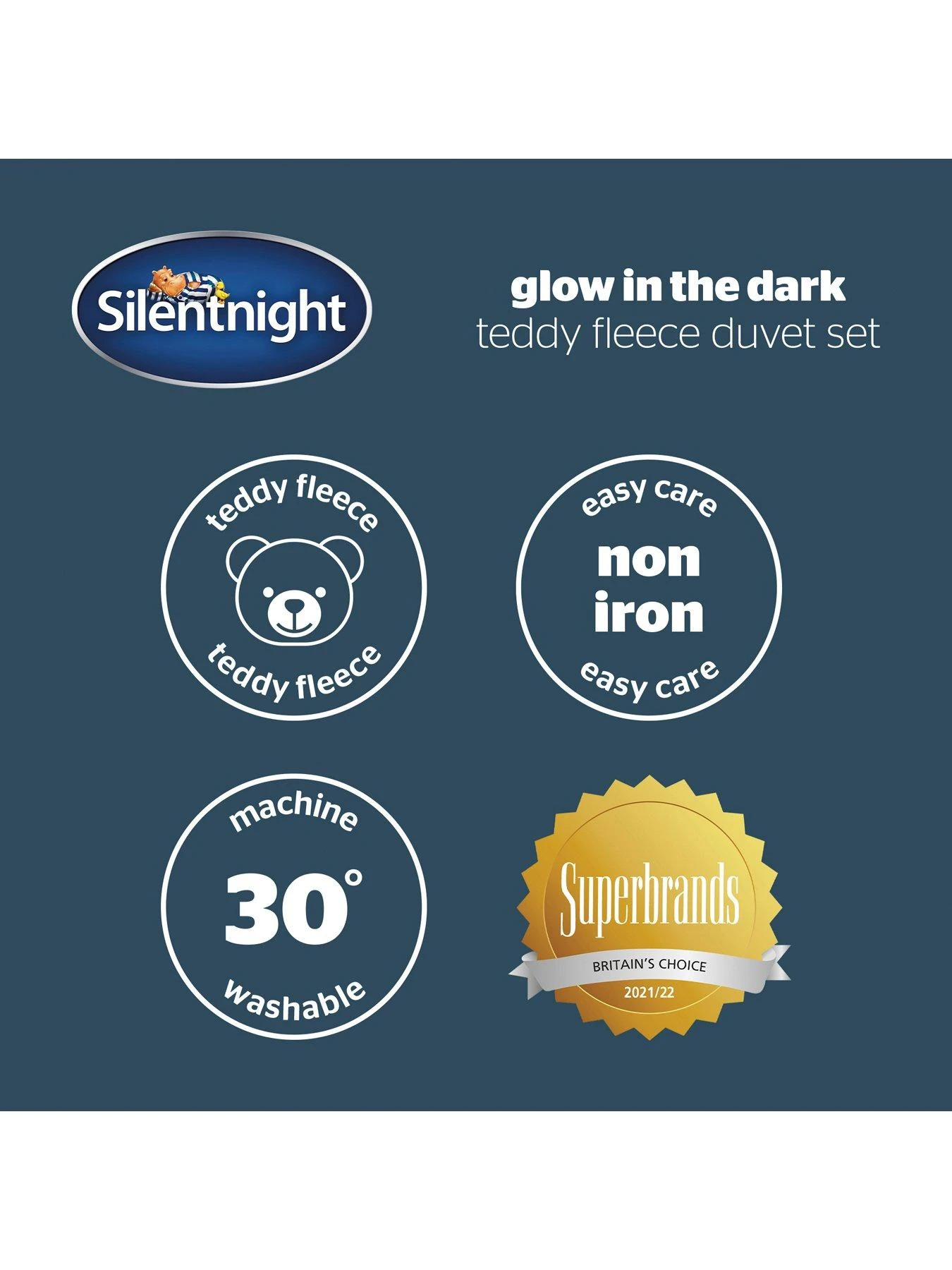 Snuggle into cosy cosmic comfort each night with the Silentnight Glow in The Dark Teddy Fleece Duvet set. This supersoft duvet comes alive in the dark! Glowing stars and moons create a magical scene to enjoy whilst you drift off to sleep. Pair with our teddy fleece fitted sheet for extra comfort.