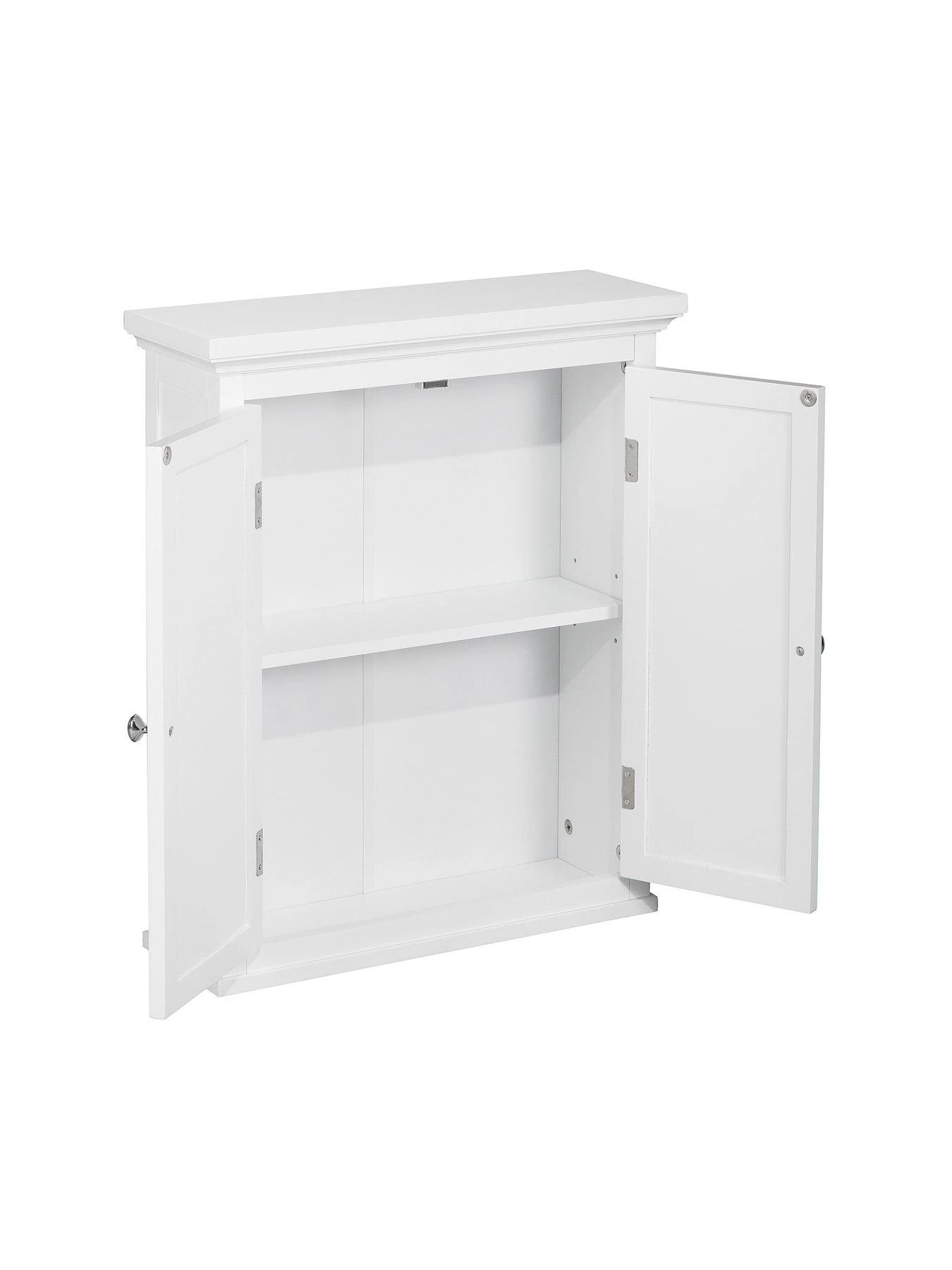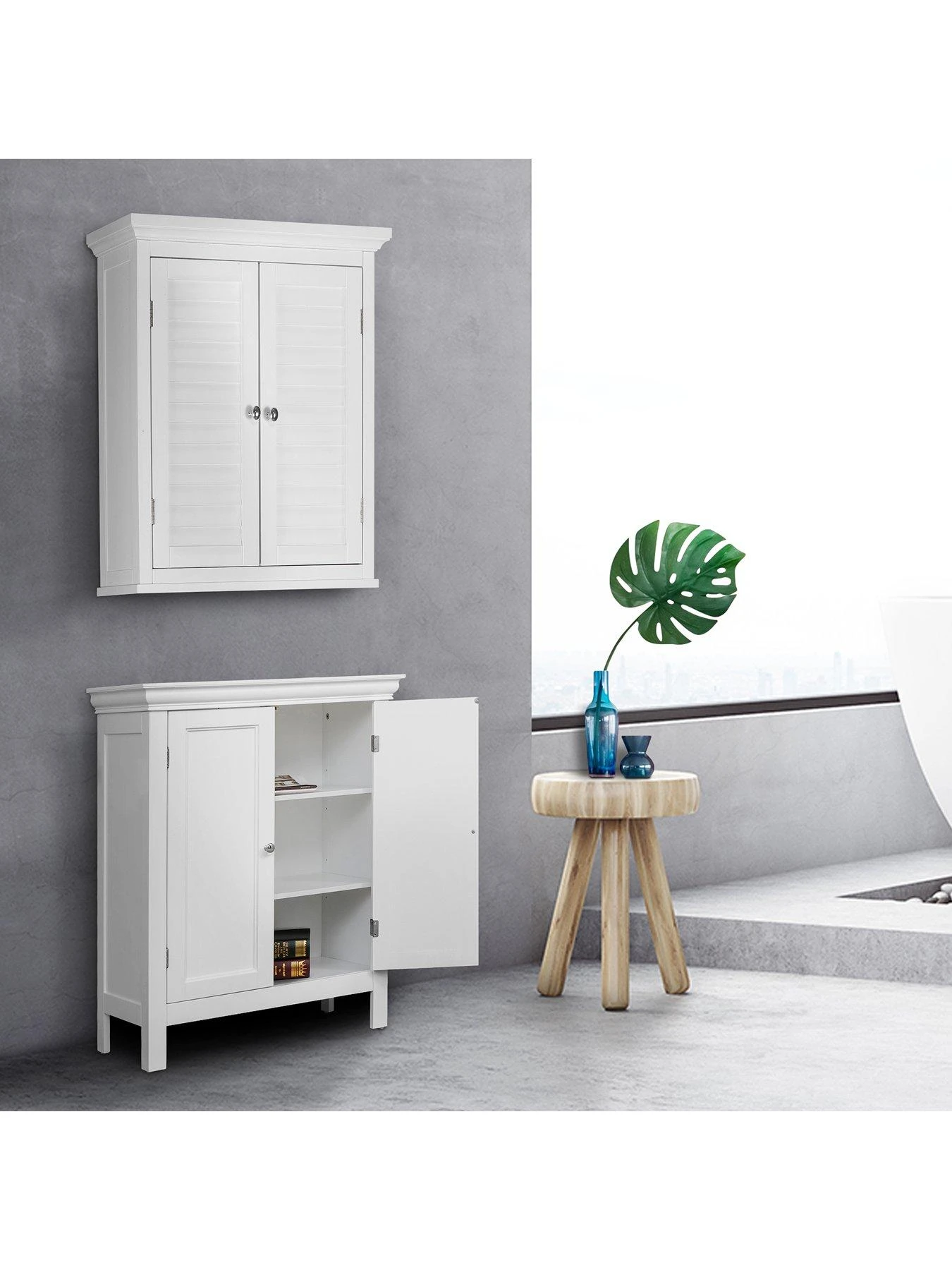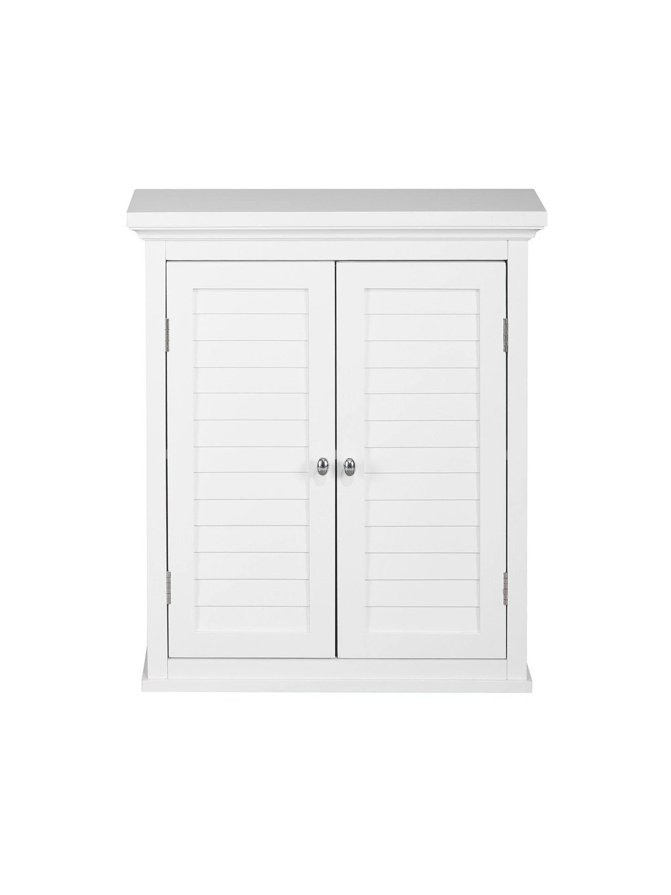 - Double louvered doors with one interior shelf. Ample space to safely and conveniently store bathroom essentials.