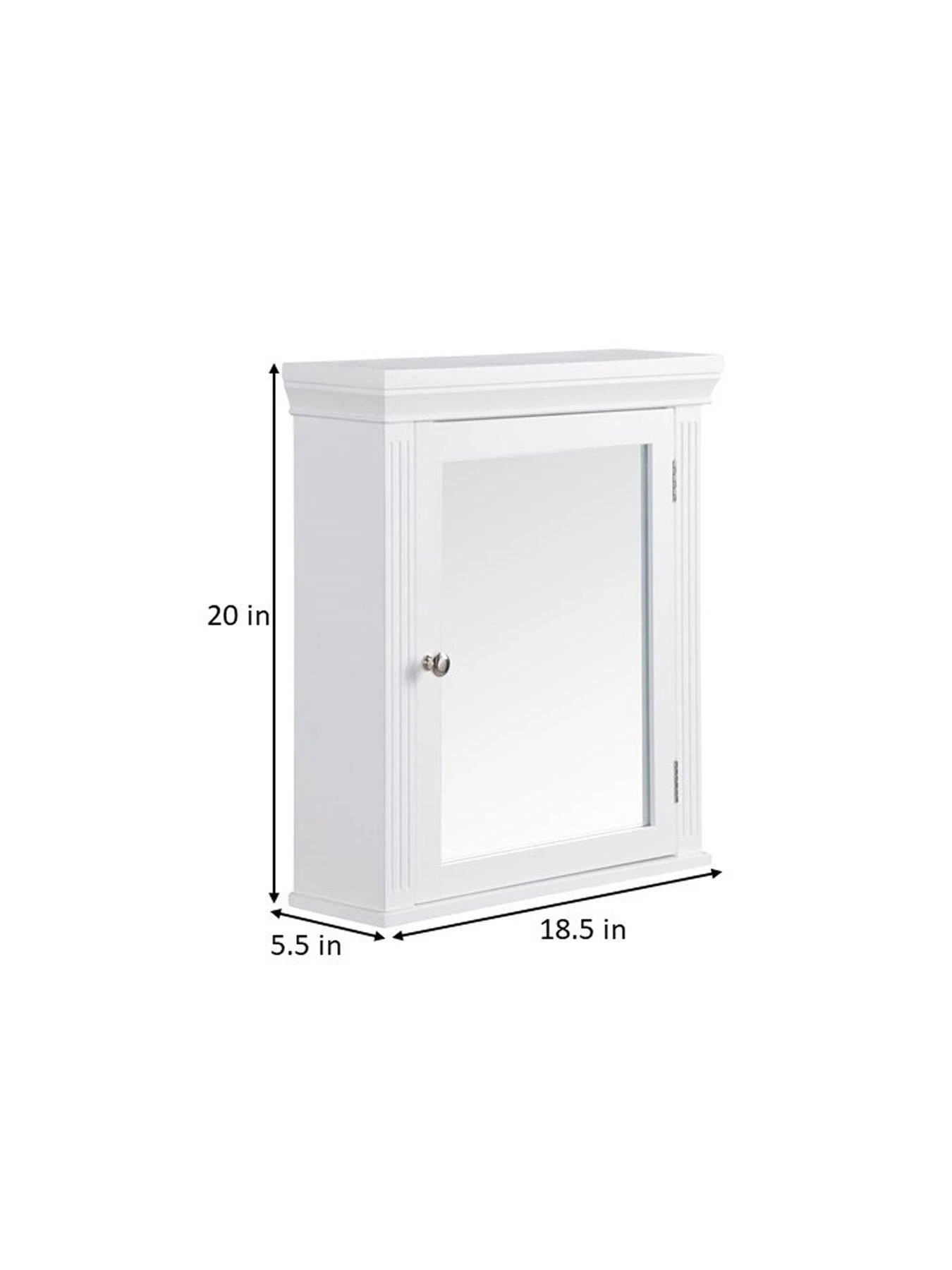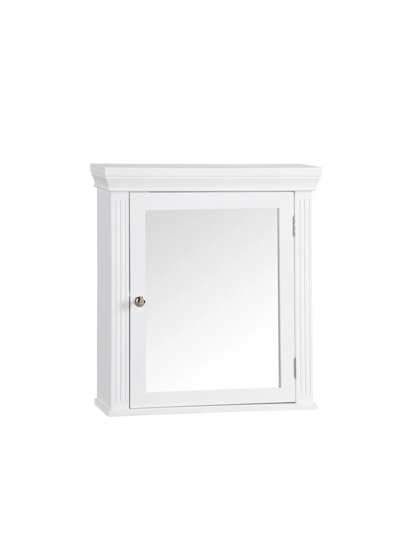 - Features a white finish with a crown molded top, a mirror door, double-plated knobs, and grooved columns for a beautiful addition to your space