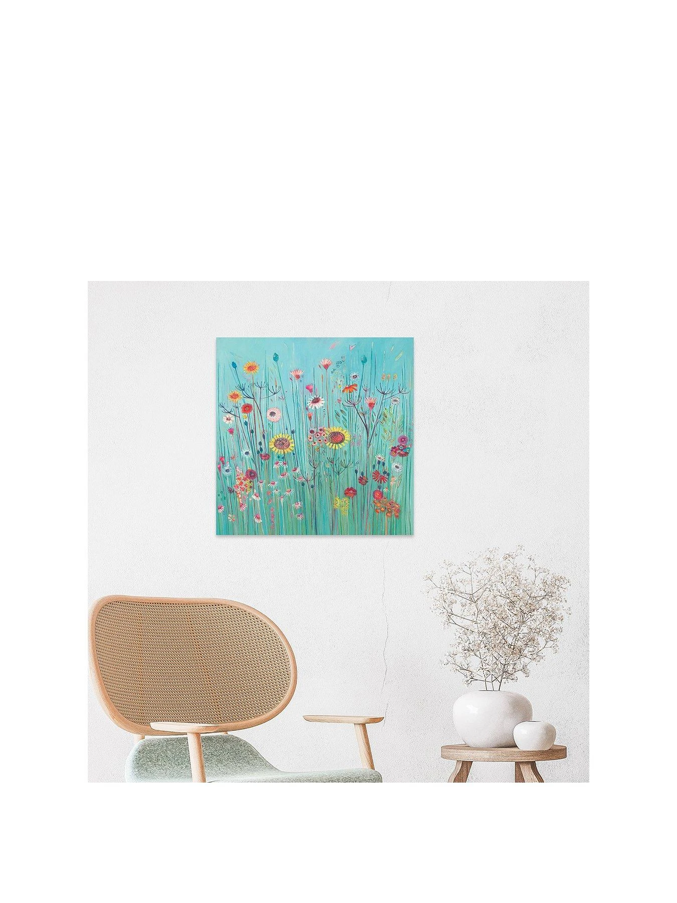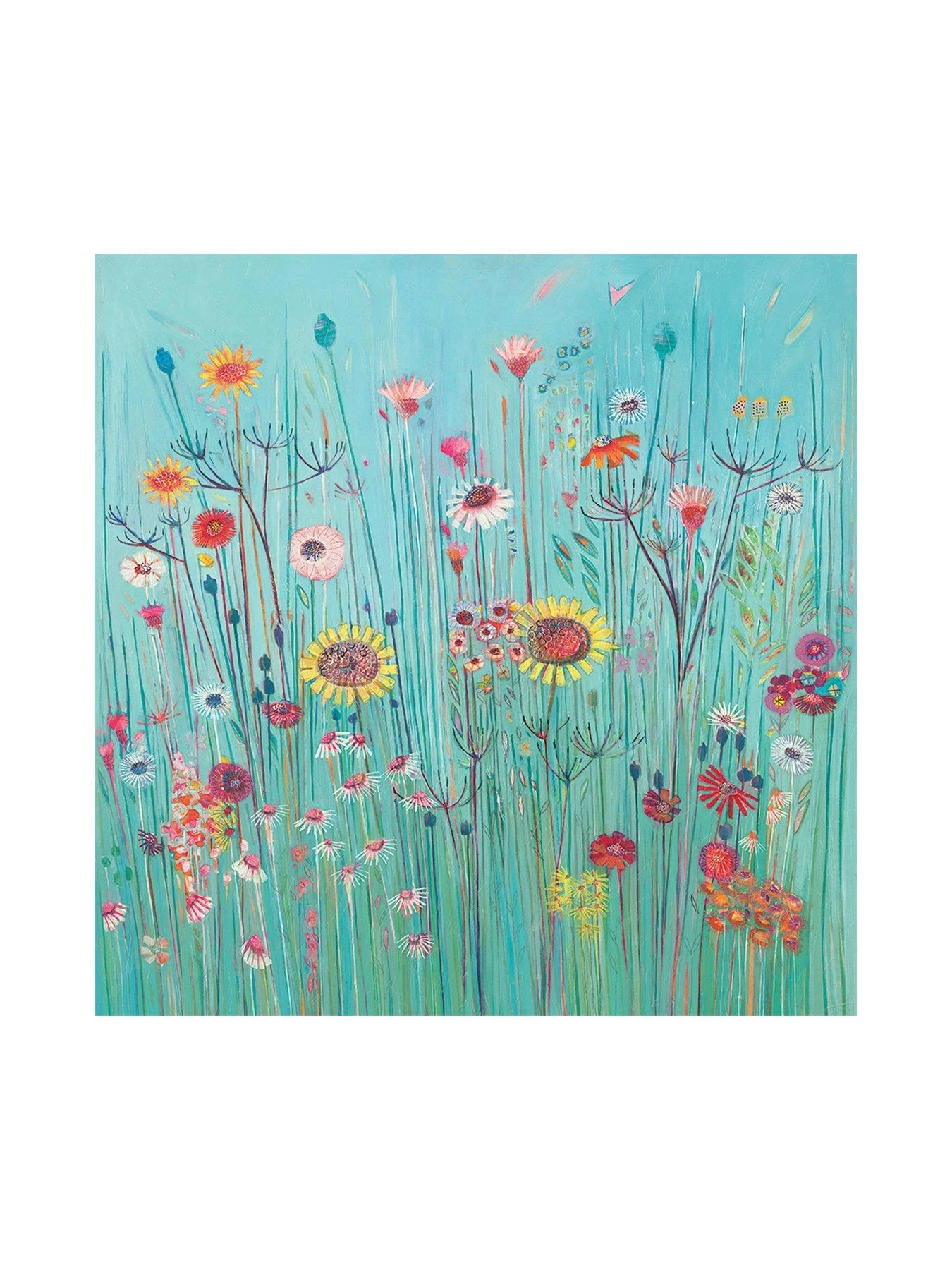 Shyama Ruffell grew up in the Sussex countryside. Her childhood memories of submerging herself in long grasses and discovering a secret magical world of colourful wildflowers and insects are a significant influence on her paintings. Shyama’s images are jammed full of colour, texture and pattern reminiscent of ceramic and fabric designs (another source of great inspiration for her). Fresh flowers always fill her studio and provide fantastic reference material together with drawings and photographs. With their semi-abstract edge, her paintings become ‘A cocktail of William Morris and Rousseau in an English meadow, with a splash of Klimt’ which is summed up beautifully on this stunning canvas!