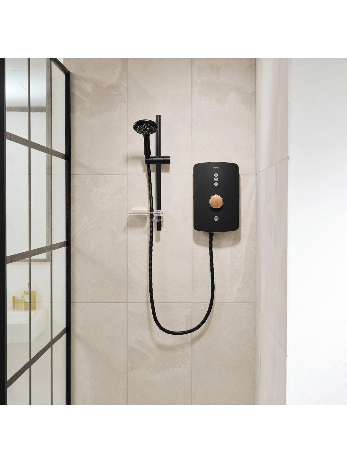 In black with brushed copper highlights, it uses illuminated soft-touch buttons to switch on, switch off, and change the flow power. Standard dial temperature controls also mean you can keep your favourite setting from shower to shower. Â