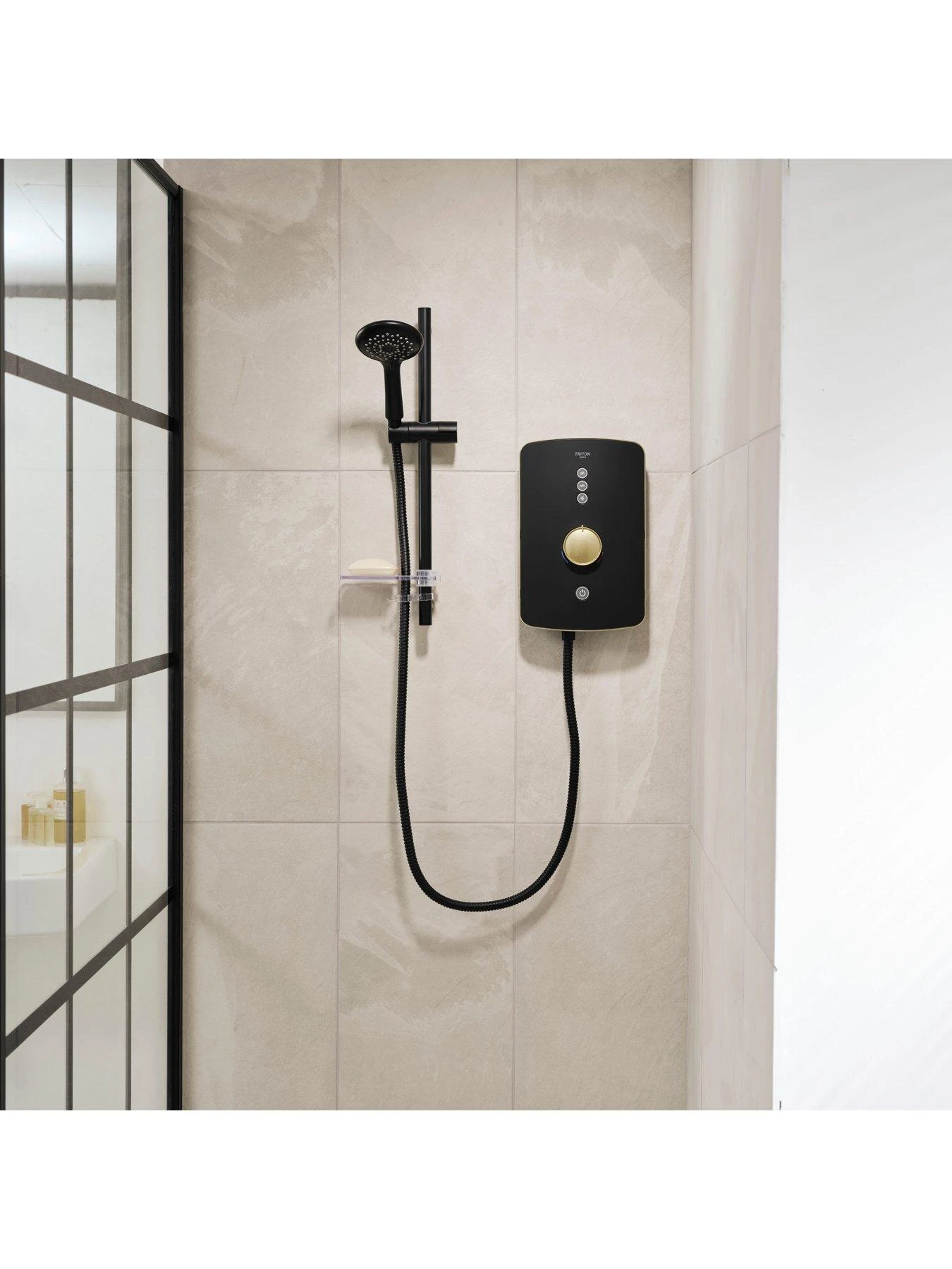 In black with brushed brass highlights, it uses illuminated soft-touch buttons to switch on, switch off, and change the flow power. Standard dial temperature controls also mean you can keep your favourite setting from shower to shower. Â