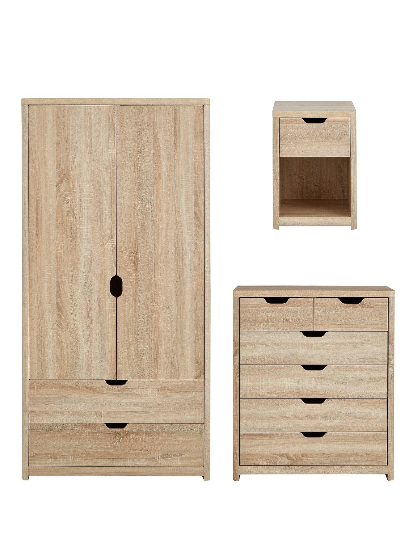 A single drawer bedside chest finishes the package, and each piece is styled with smooth rounded corners, curvy cut-out handles and easy-glide metal runners.