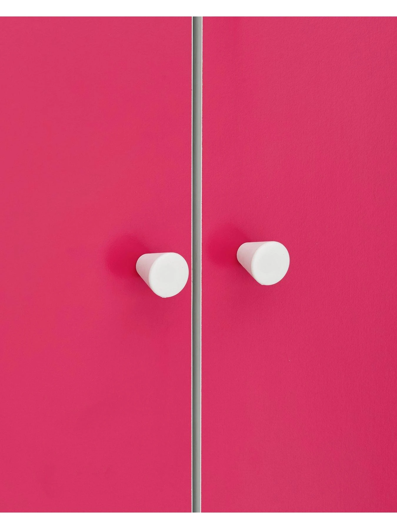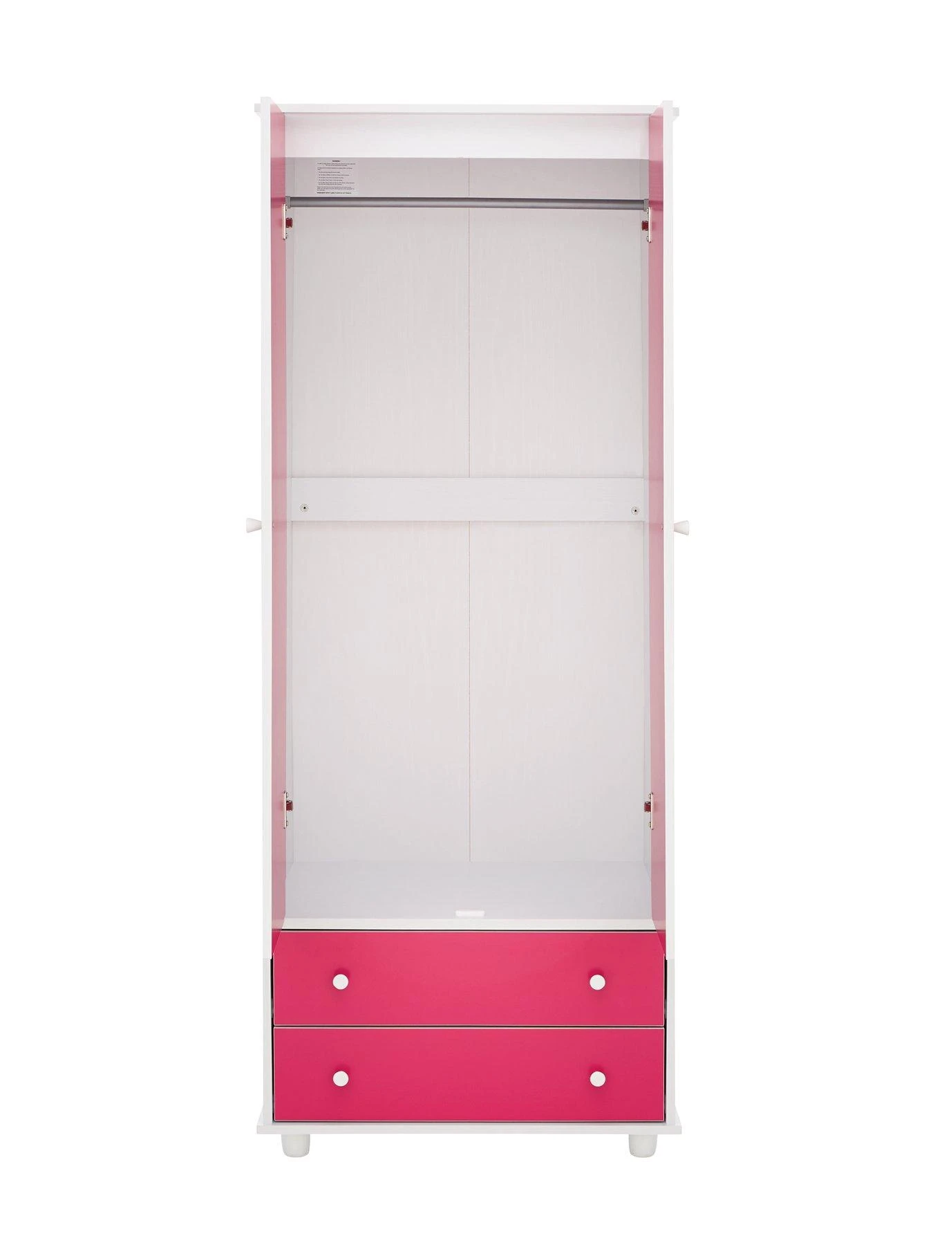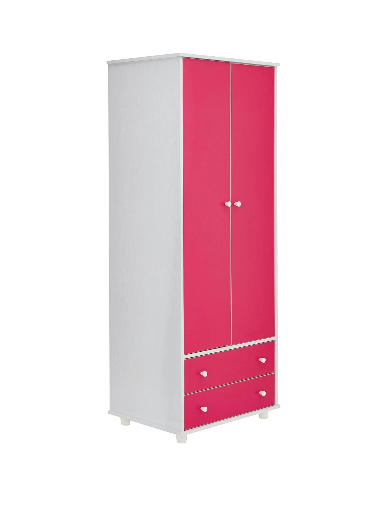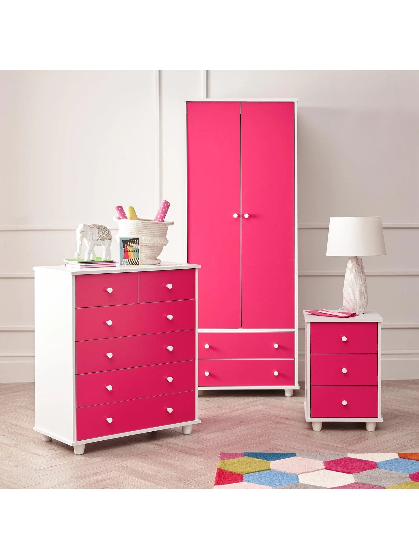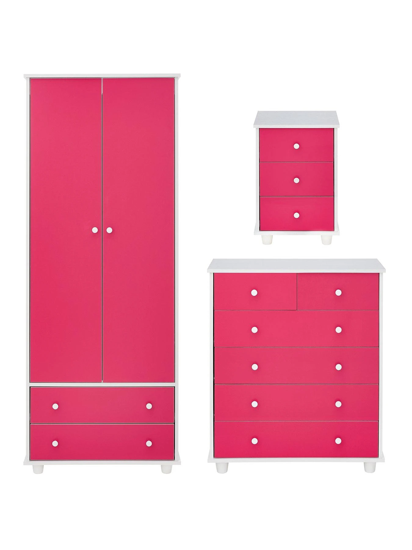 Comprising a 2 door, 2 drawer wardrobe, chest of 5 drawers and a bedside chest, it features a white frame and contrasting bright pink doors and drawer fronts.