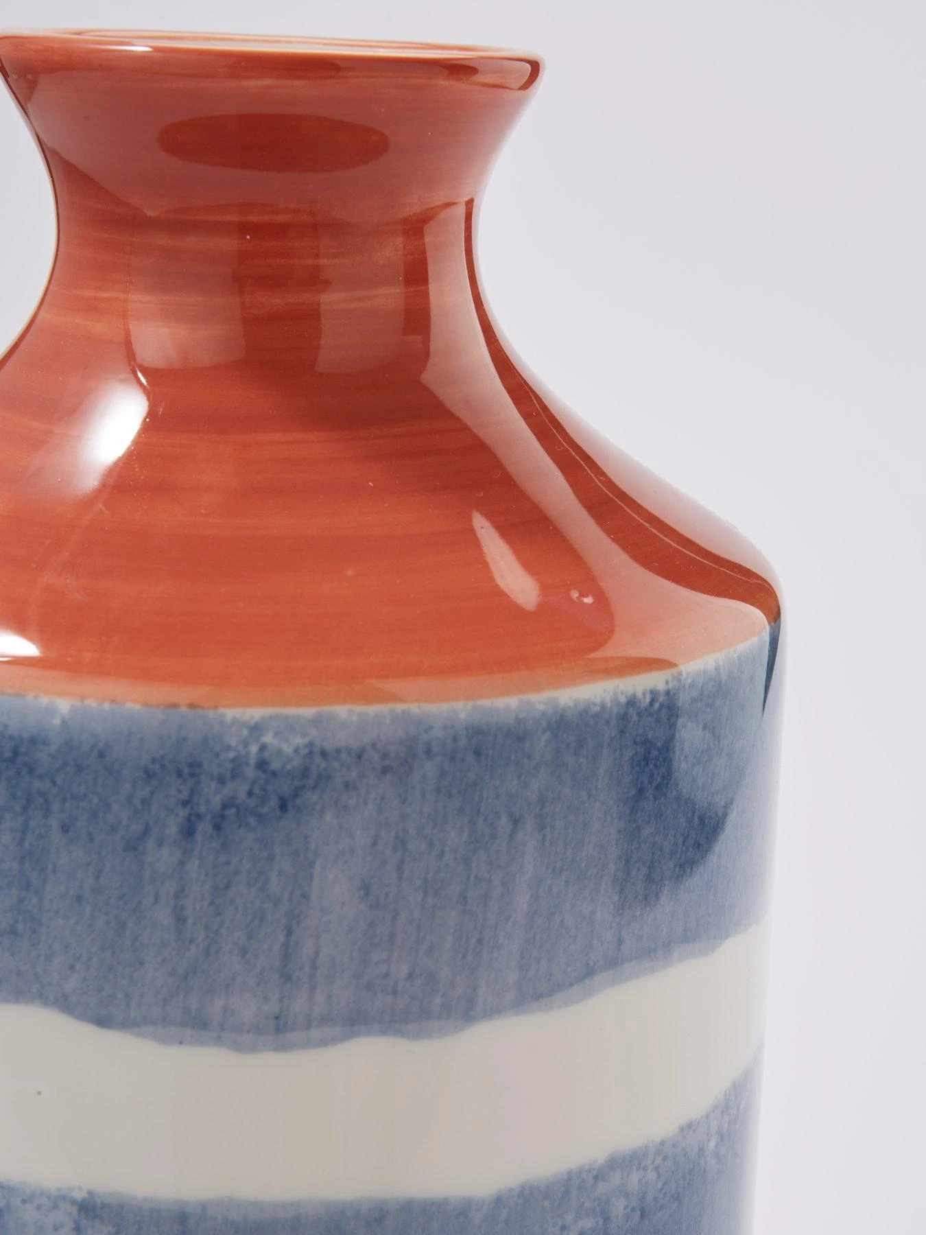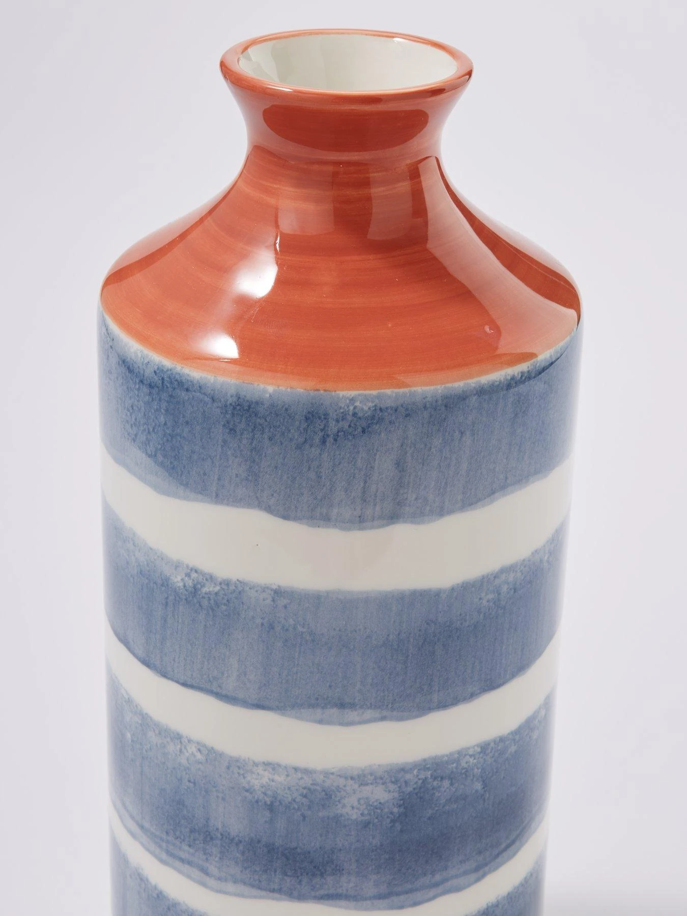 Standing 31 cm tall, it’s brought to life by a blue and white striped pattern, along with a warm terracotta top. A thin opening means it works well as a purely decorative piece, however it also looks great with a couple of fresh or faux flowers placed inside.